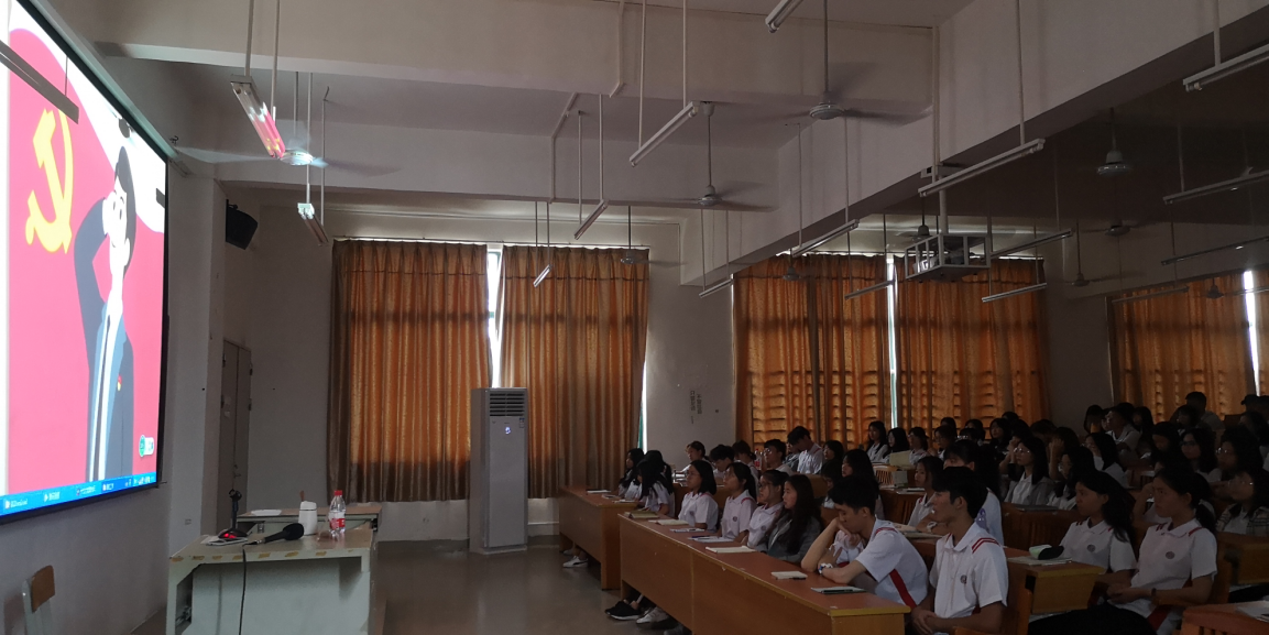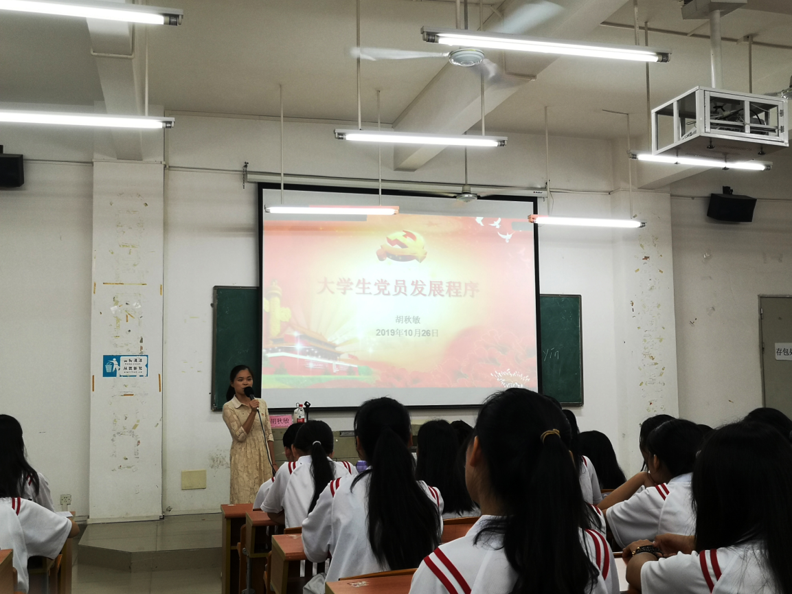 胡秋敏书记从发展党员的总体要求、党员发展工作的基本情况、发展党员的程序和手续三个方面展开,向全体学生介绍了发展党员的的五个阶段(入党申请人、入党积极分子、发展对象、预备党员、正式党员)、25个流程。期间通过国贸学院党员大会、自荐会等会议和相关视频介绍,使全体同学进一步了解入党流程。最后寄语全体学生始终以党员标准严格要求自己,积极向党组织靠拢,争取早日加入中国共产党。