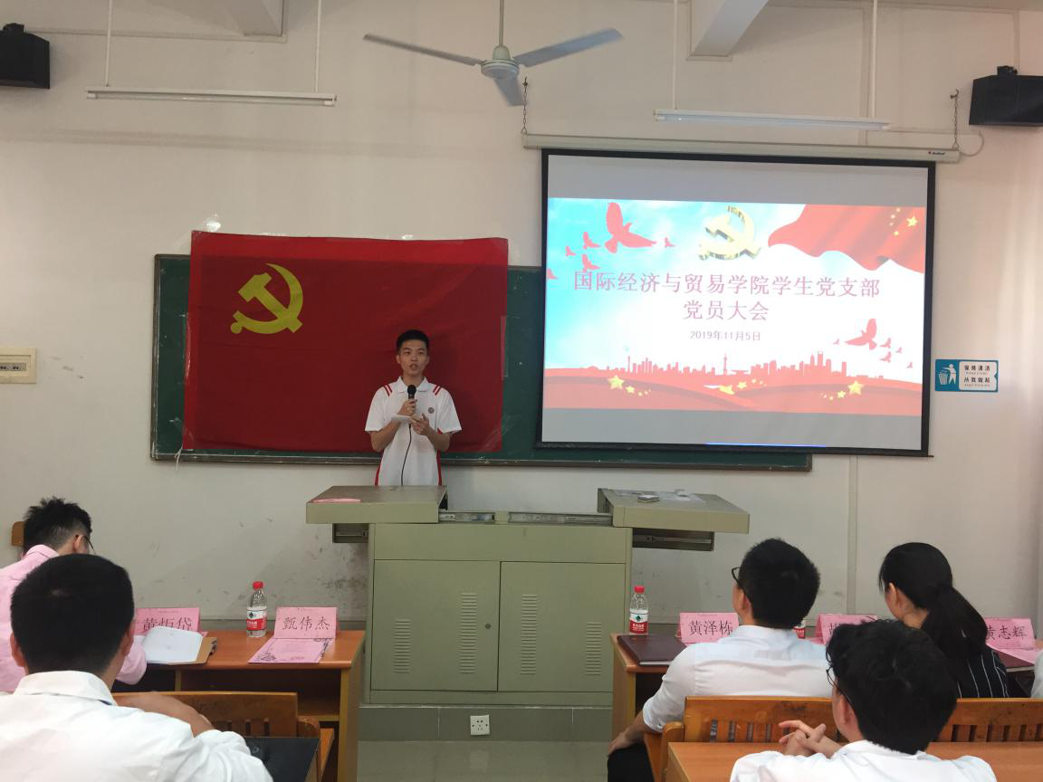 11月5日下午16:00,国际经济与贸易学院学生党支部党员大会在博学楼B302召开,出席本次大会的有学院党总支黄泽栋书记、学生党支部胡秋敏书记、教工党支部黄志辉书记、学生党支部黄炬岱副书记、纪检委员李悦老师、辅导员余锋老师、甄伟杰老师、教师党员黄雪芳老师、全体学生党员以及2019年秋季学期发展对象。