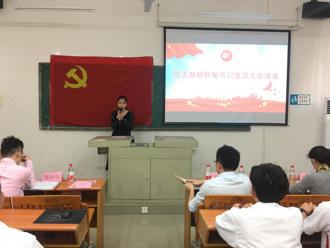 最后,由学生党支部胡秋敏书记宣读关于同意接收吕莹莹等8名发展对象为中共预备党员的大会决议。