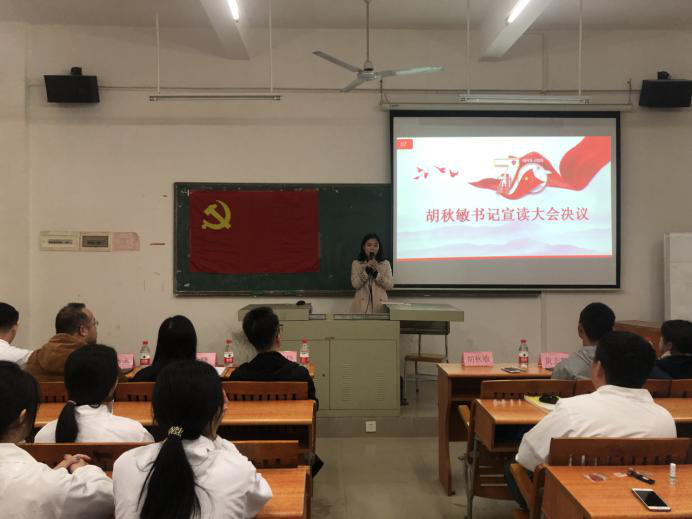 最后,由学生党支部胡秋敏书记宣读关于同意接收陈锐芬等18名发展对象为中共预备党员的大会决议。