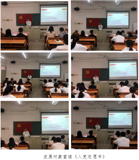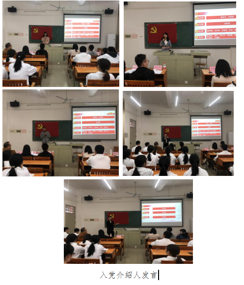 伴随着国际歌的响起,大会拉开了序幕。首先进行的是讨论是否接收陈锐芬等18名发展对象为中共预备党员。18名发展对象依次宣读入党志愿书,向大会汇报自己对党的认识、入党动机、现实表现等情况。入党介绍人通过对发展对象的日常考察,分别介绍发展对象的主要情况,并对其能否入党表明了明确意见。
