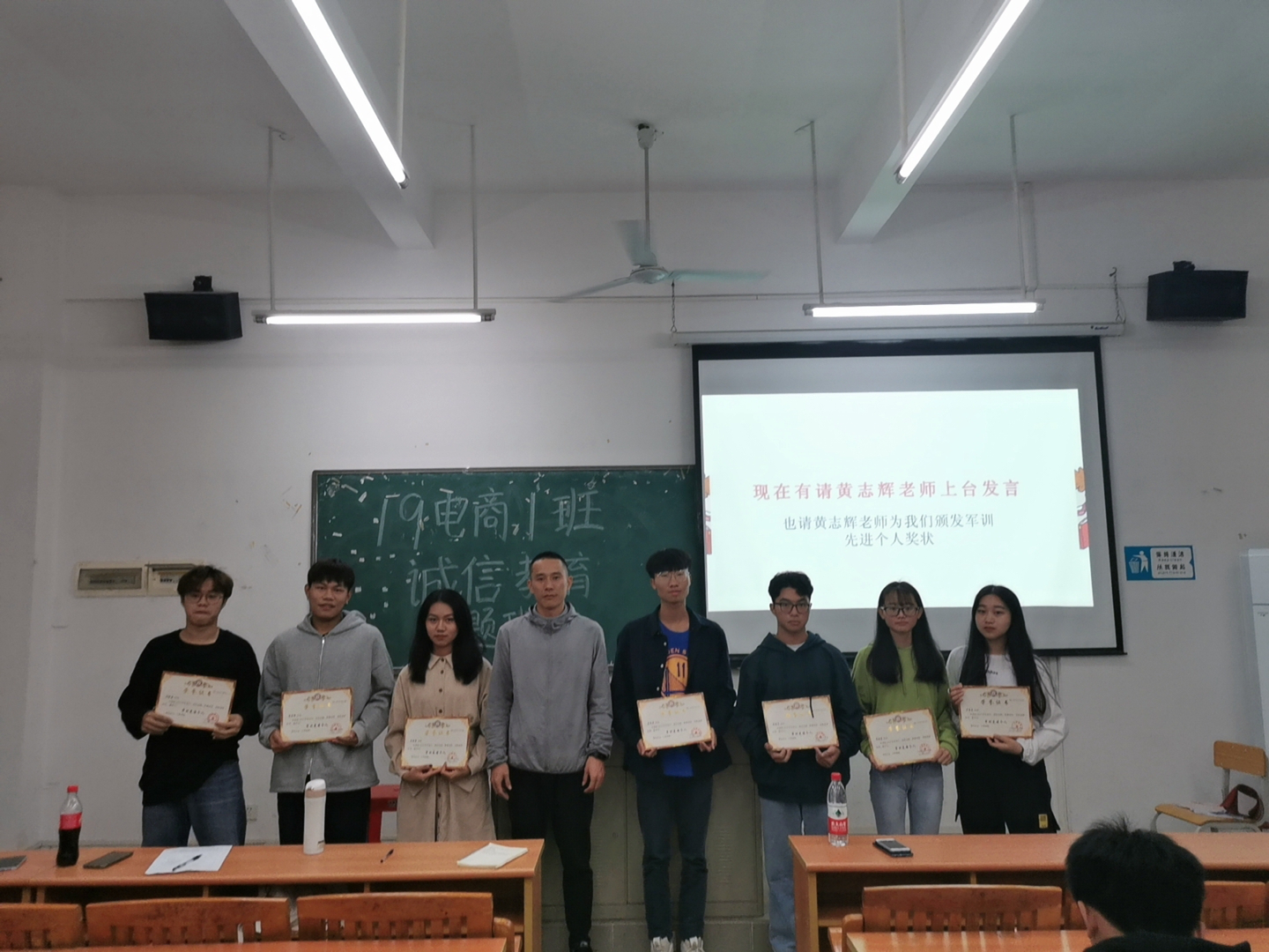 接着,班主任黄志辉老师为在军训中获得“军训先进个人”荣誉的同学颁发荣誉证书并和获奖的学生合影留念。