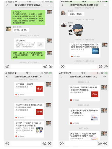 3月24日,国贸学院教工党支部以微信群分享推文的学习方式开展了“立足岗位守初心,抗击疫情担使命”主题党日线上学习活动。