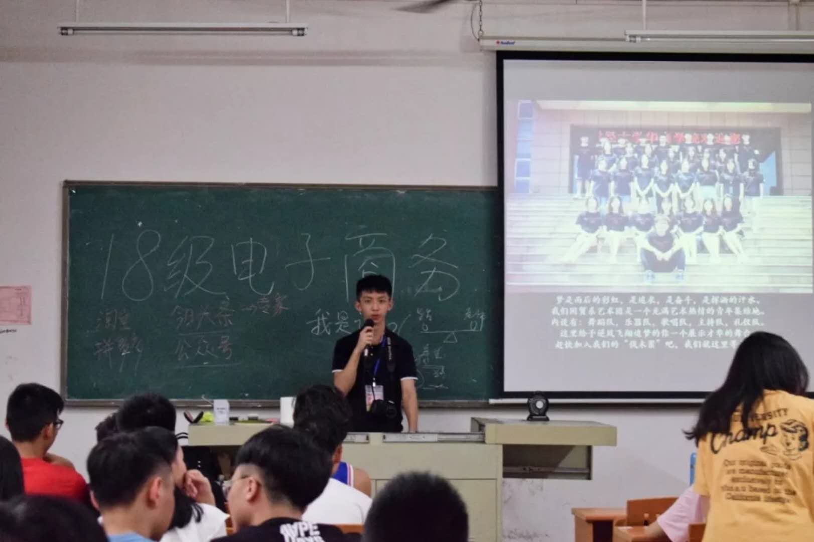 在报到的第二天,2018级新生在班助们的带领下在博学楼召开了第一次新生班会。紧接着,班助们用PPT向新生们介绍学校的领导老师、讲解军训注意事项。在此期间,学生会成员也来到了班会现场进行宣传,并向大家详细介绍国贸系学生会。最后,各班辅导员发言,老师们希望大家都可以好好地和新同学们相处,开始正确地认识大学,规划好自己未来的大学生活。
