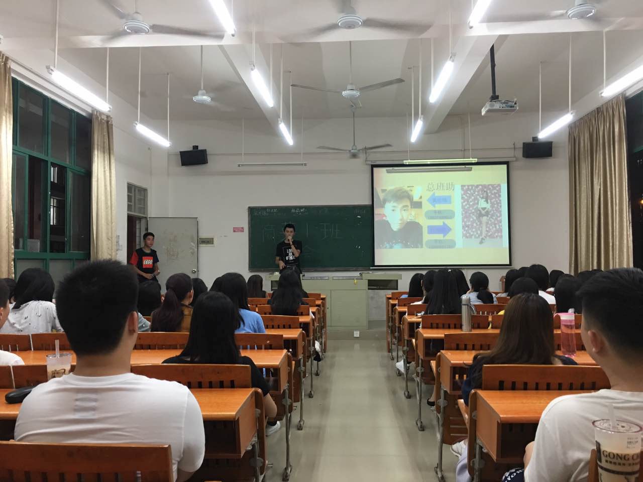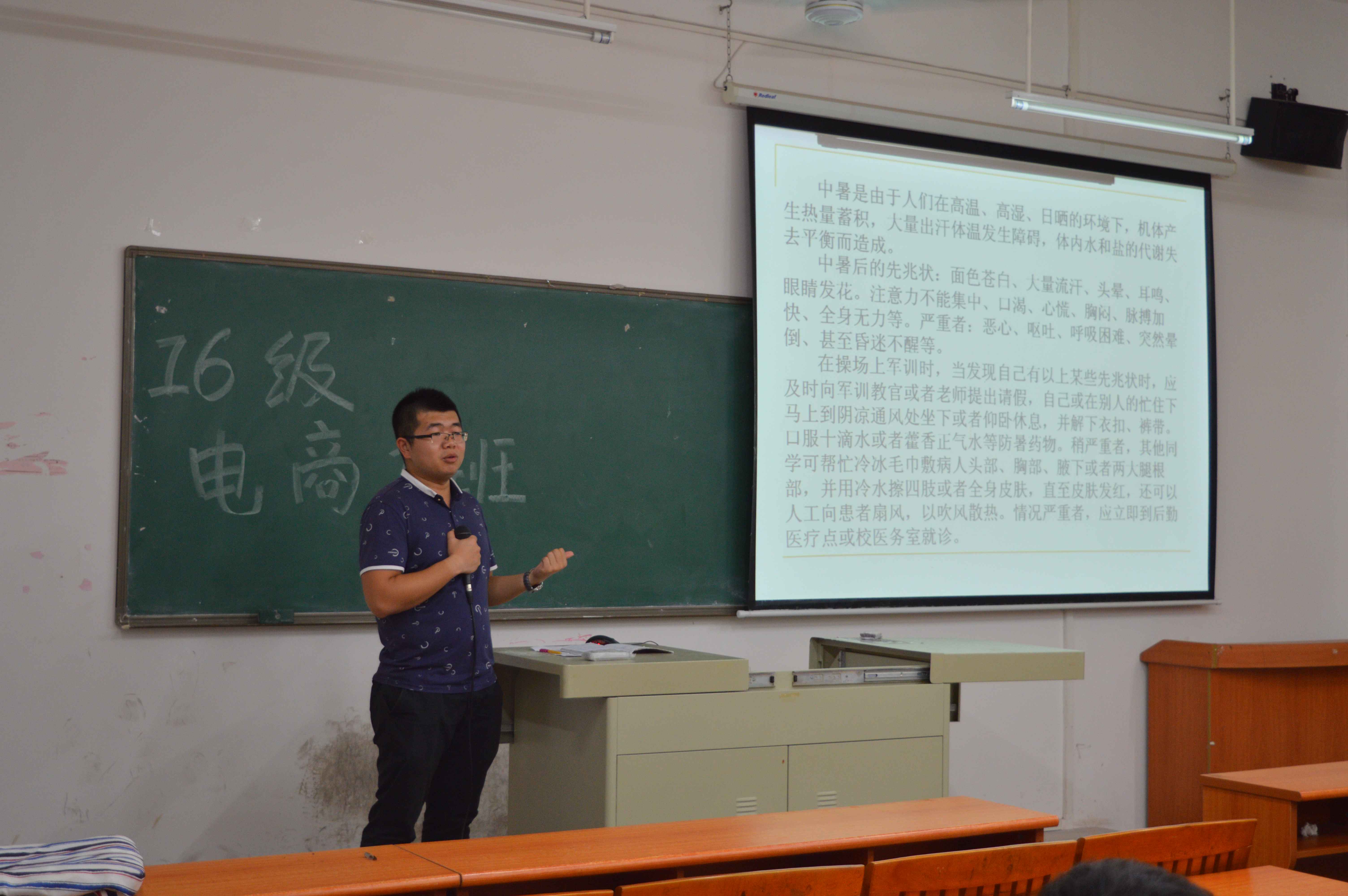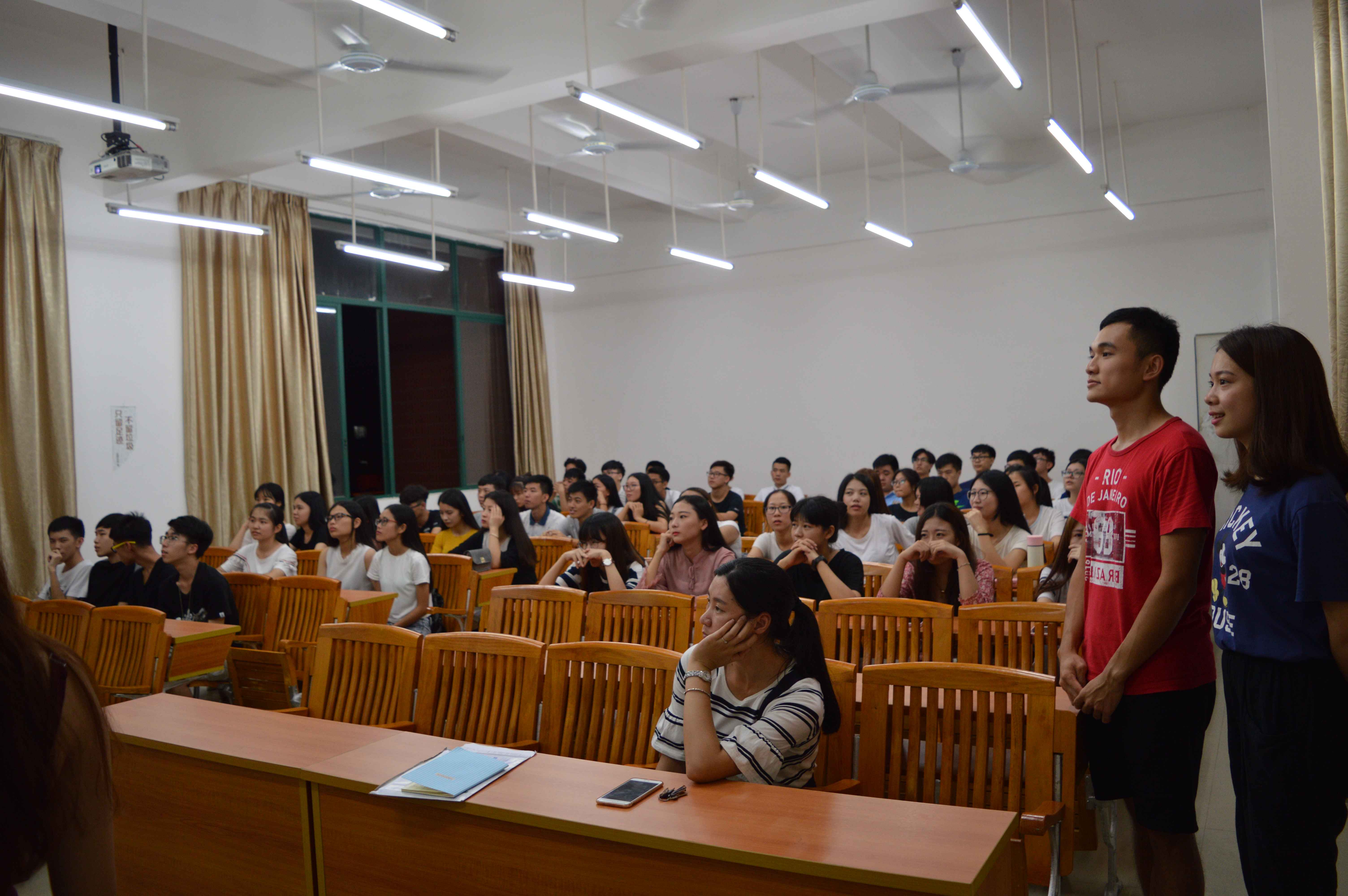 助理班主任、辅导员和教官分别讲话,都提出希望同学们能享受大学,寻找不一样的自己;积极参加活动,丰富自己的大学生活;军训中锻炼好自己,激发自己的潜能。当然,为了调动班会气氛,我系学生会成员也出现在班会现场,向新生们介绍我系学生会过去一年所举办的活动以及九大部门,希望同学们能感受这份热情与爱。