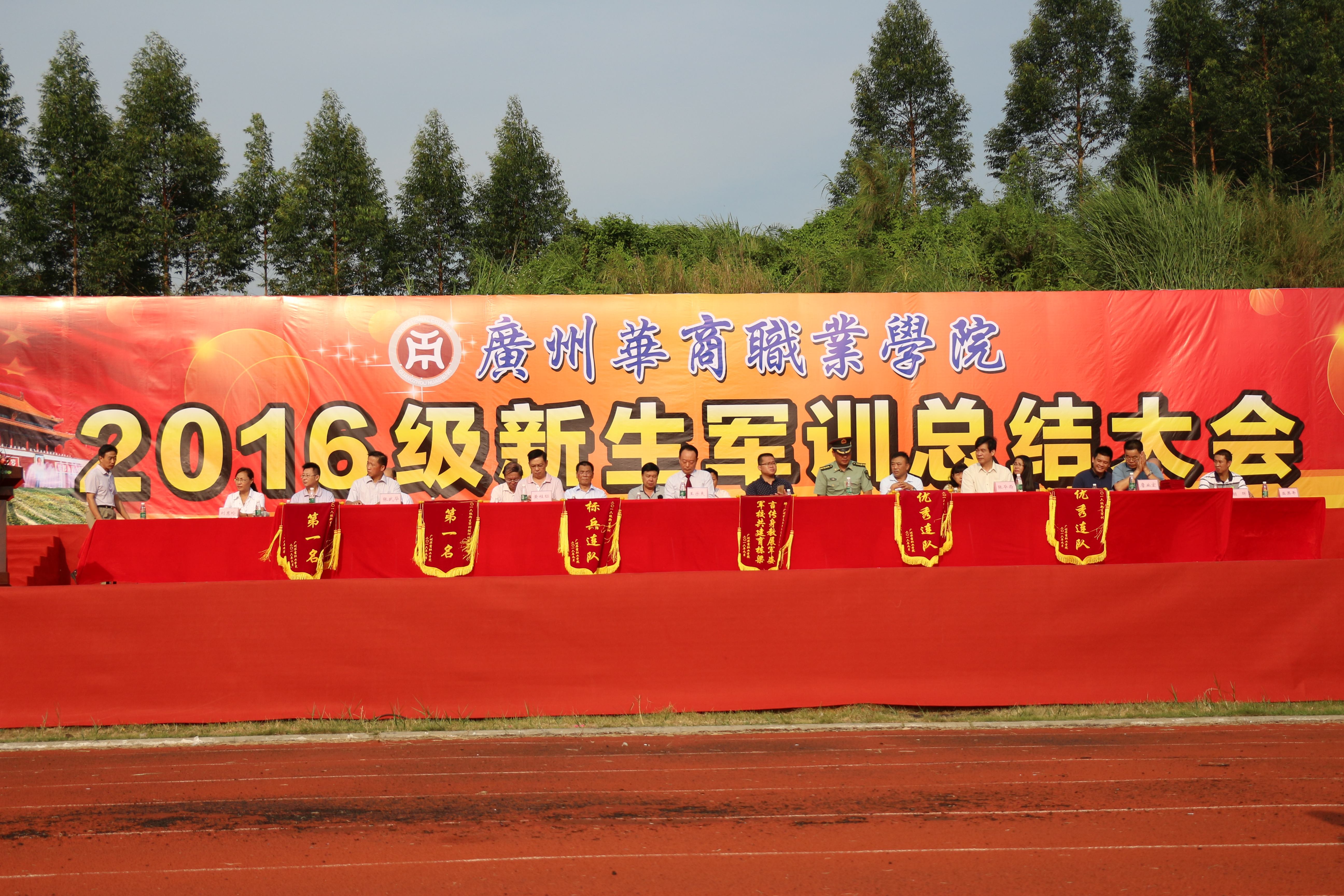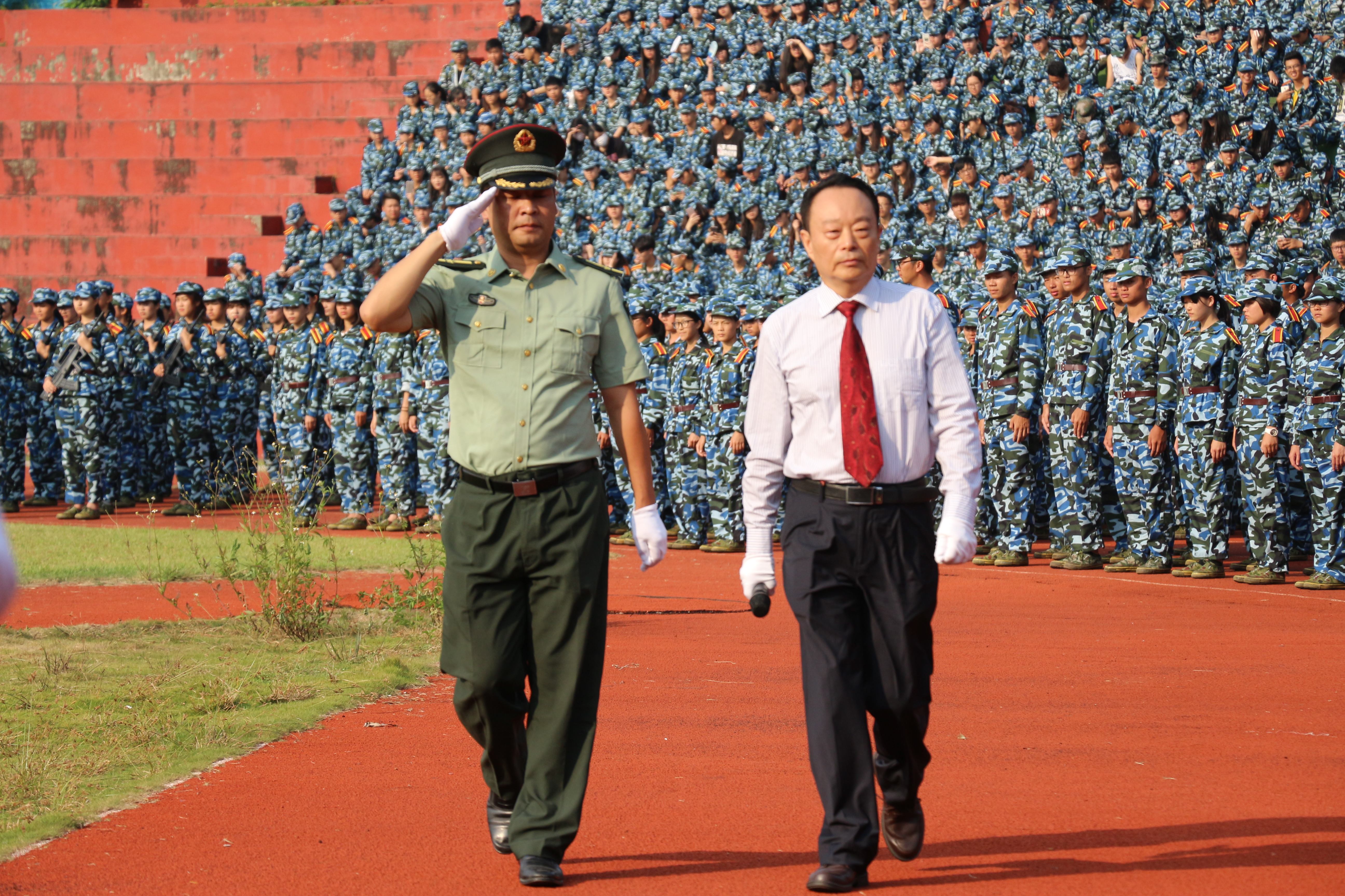 2016级新生军训汇演暨总结大会于今天早上8点在西田径运动场举行。学院院长王乐夫、党委书记黄桂标、常务副院长张毕西、副院长詹业宏、副院长张武华、承训部队领导及各系学工负责人与新生辅导员出席本次大会.
