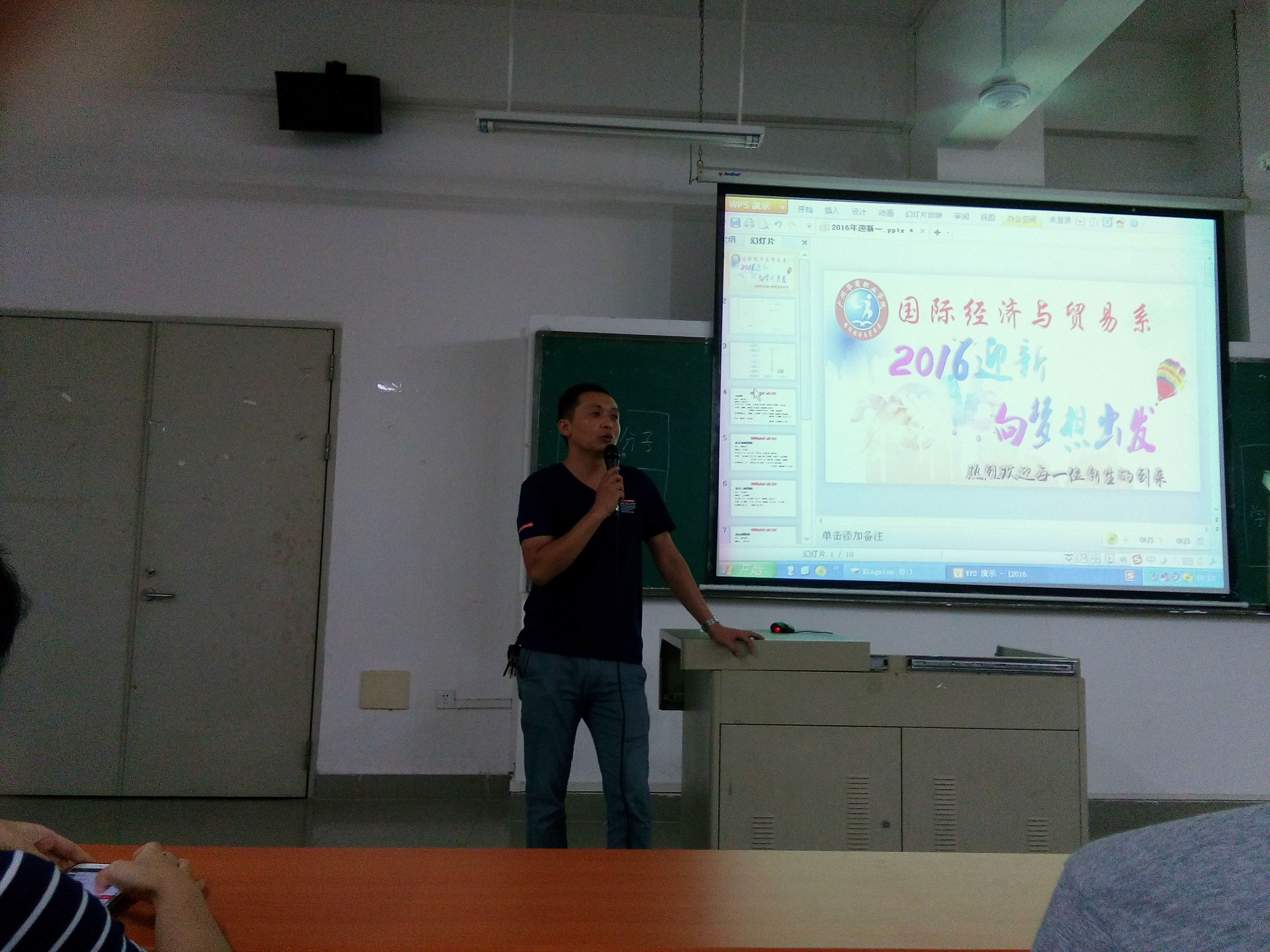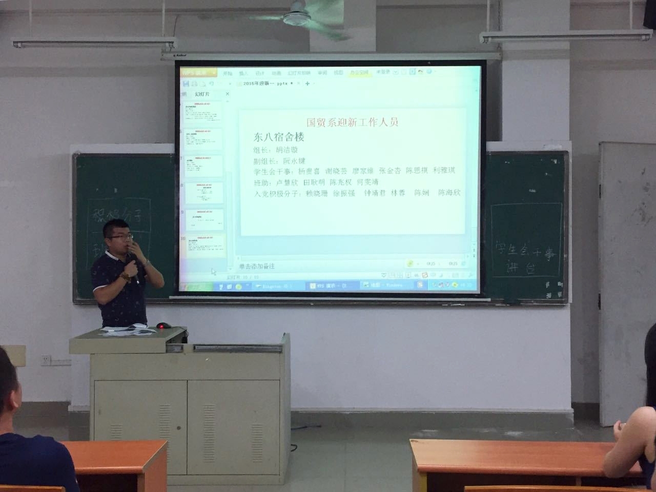 为更好的完成一年一度的迎新工作,2016年9月8日晚上七点, 国际经济与贸易系动员大会于2016年9月8日晚上7点在博学楼A207召开. 系学工助理孔凡龙、学生会指导老师吴仕坚及各级辅导员出席动员大会.