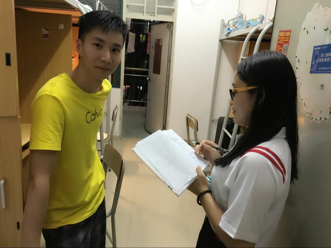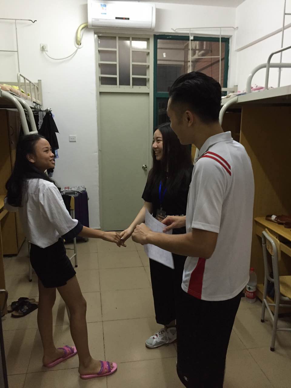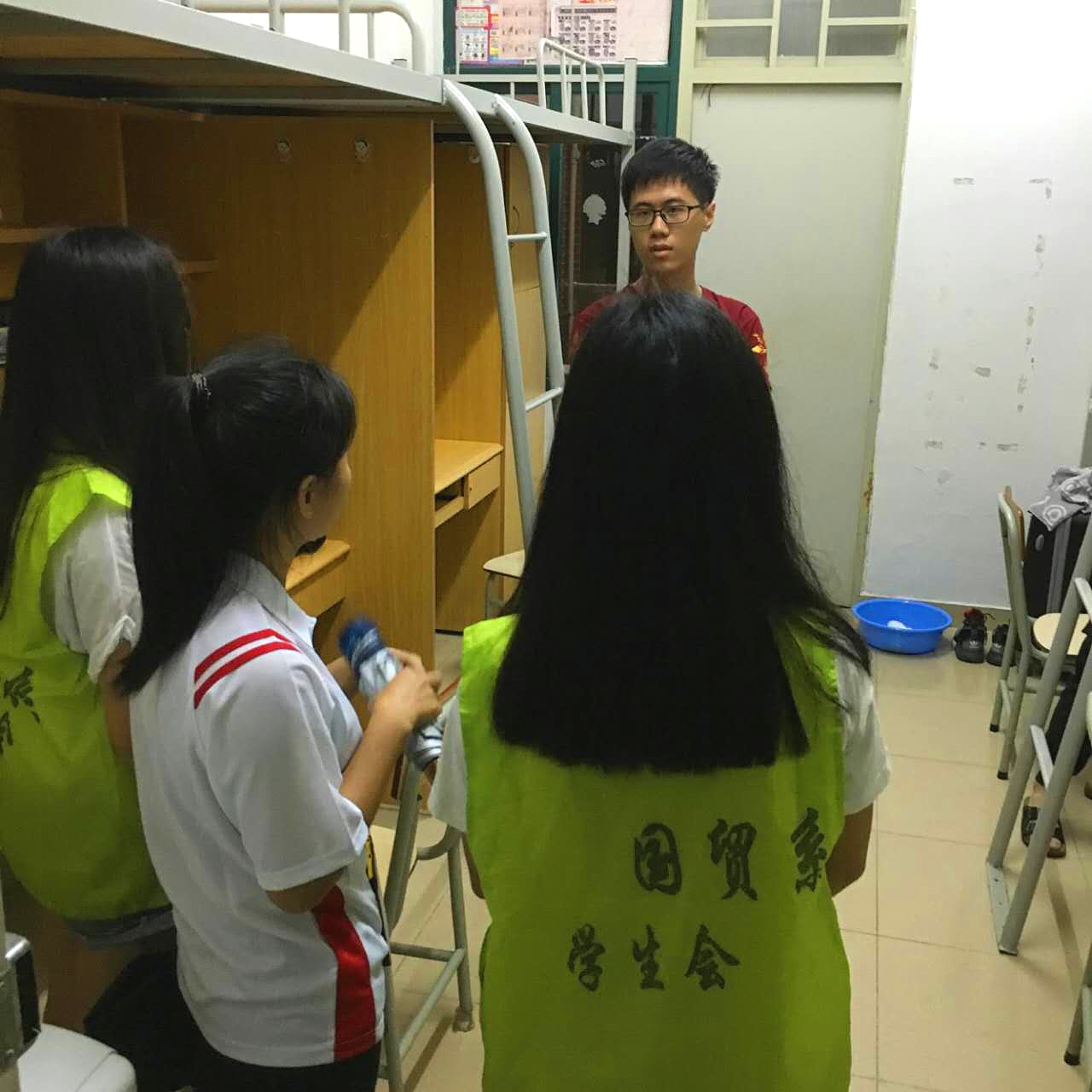 在新生宿舍楼中,我系助班、学生会工作人员向每个宿舍简单地介绍我系学生会以及上一年我系所取得成就;同时解答新生关于学习以及生活上的各种问题,帮助新生尽快适应学校生活以及提醒新生军训做好准备.学校领导也亲自来到新生宿舍进行访查,切实关心新生入住情况并提出各组织要帮助新生尽快适应学校生活.我系学生会指导老师吴仕坚也全程陪同并提出工作人员所需要注意的事项.