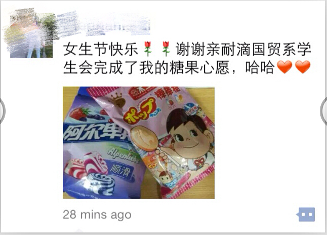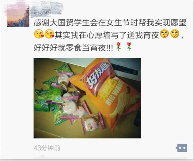 2016年3月5日至3月7日,国贸系“心愿墙”女生节活动在国贸系微信平台进行推广。活动对象是全院学生,旨在帮助女生们实现心愿。