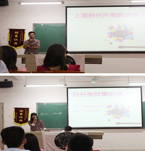 大会开始,主持人为新干事、会员简单介绍了英语星空俱乐部,播放社团视频,让新干事和会员对社团有了大概的了解,并邀请前任会长朱德顺和新任会长分别发表讲话,希望新干事们能够积极努力,与社团干部齐心协力将协会发展的更好,积极推动社团的未来发展。