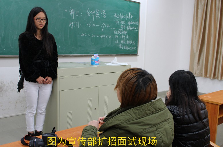 为注入新活力,保证宣传部工作的顺利进行,国贸系团总支学生会宣传部于12月11号晚七点半在博B306进行了扩招面试。