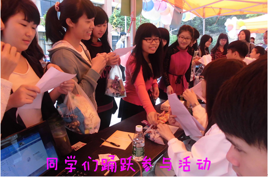 国贸系在此次活动中设计了“看英文猜谚语”、“英文绕口令”等独特创意的英语游戏,再加上学生会工作人员的热情迎接和林郁松同学的精彩表演,吸引了不少女生前往参与。参与活动的女生个个体现了自身非凡的本领。简单有趣的活动,让她们展示自己英语才能同时,也获得国贸系赠出的一件件小礼物。女生络绎不绝的参加,使国贸系摊位呈现出一幅幅热闹活泼的场景,笑声弥漫着整个摊位。经过一个半小时的活动,最后,游戏活动在同学们的欢笑声中结束。