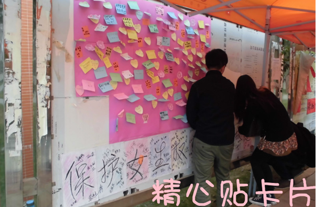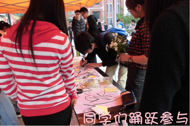 在学生会成员的精心布置下,使活动形式显得新颖有趣,引来了众多同学的参与,使得活动现场热闹非凡。女生们写出了心愿祝福卡片并在横幅(保护女生权益 从我做起)上签名,在学生会成员的协助下亲手把卡片挂到展板上,将祝福传递给每一位同学。最后,学生会成员主动为参加活动的女生送上小礼品,以示心意。