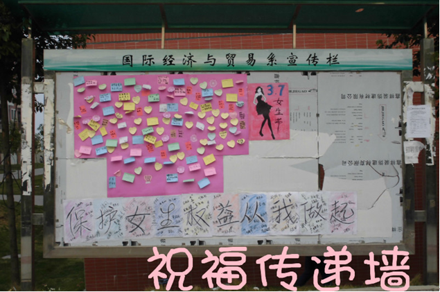 在阳光明媚的春天里, 广州华商职业学院国贸系为庆祝女生节的到来,于2013年3月7日在国贸系宣传栏前举办以“保护女生权益 从我做起”为主题的“写心愿送礼品”女生节活动。