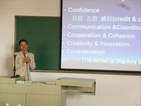 大会的第二项议程是国贸系周岳梅主任发表重要讲话。周主任寄予了我们“五个C”的工作信条(WORKING CREDO)与期望: CONFIDENCE(有信心),COMMUNICATION(善于交流与沟通),COOPERATION(注重团队合作与凝聚力),CREATIVITY(有创意与创新),CONSIDERATION(考虑周全并关注细节)。