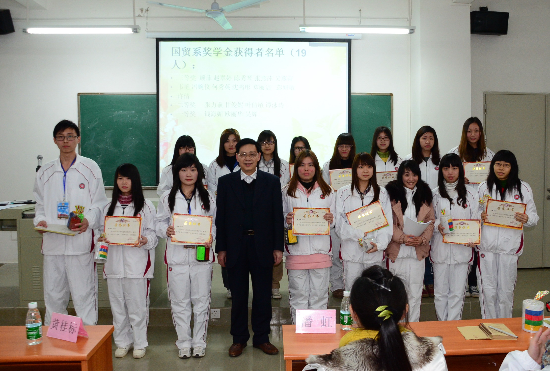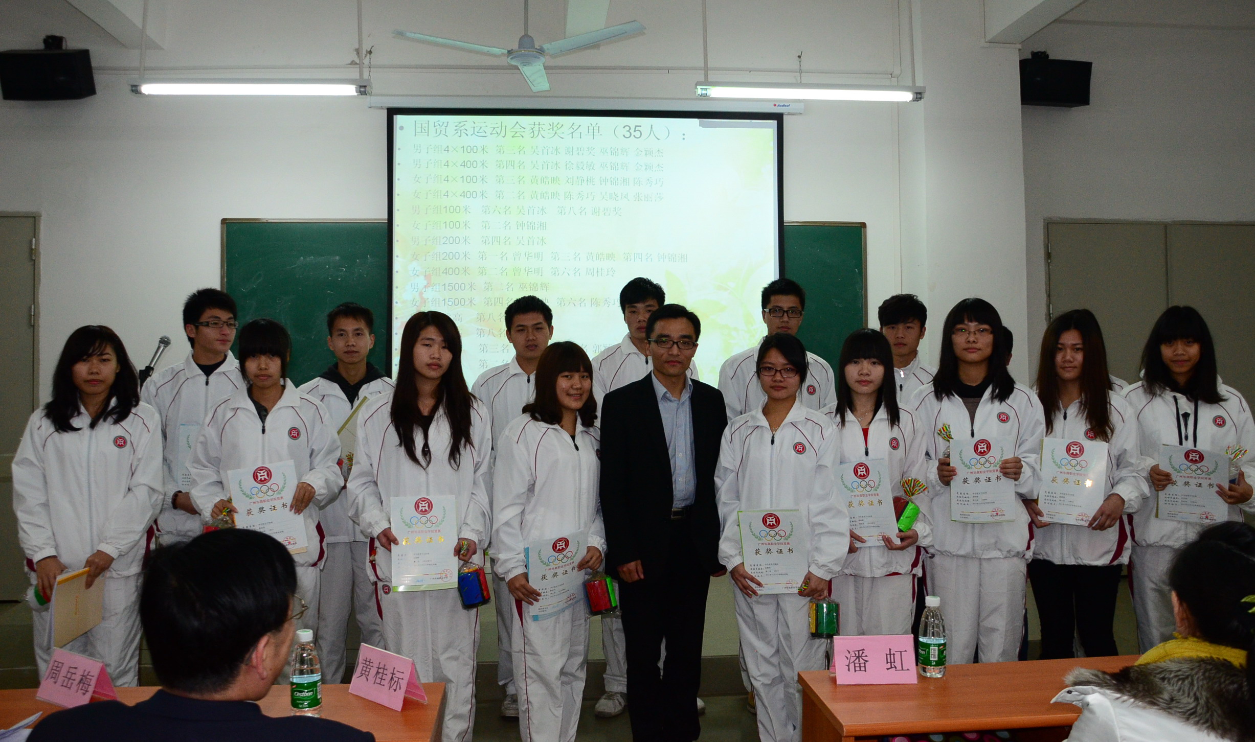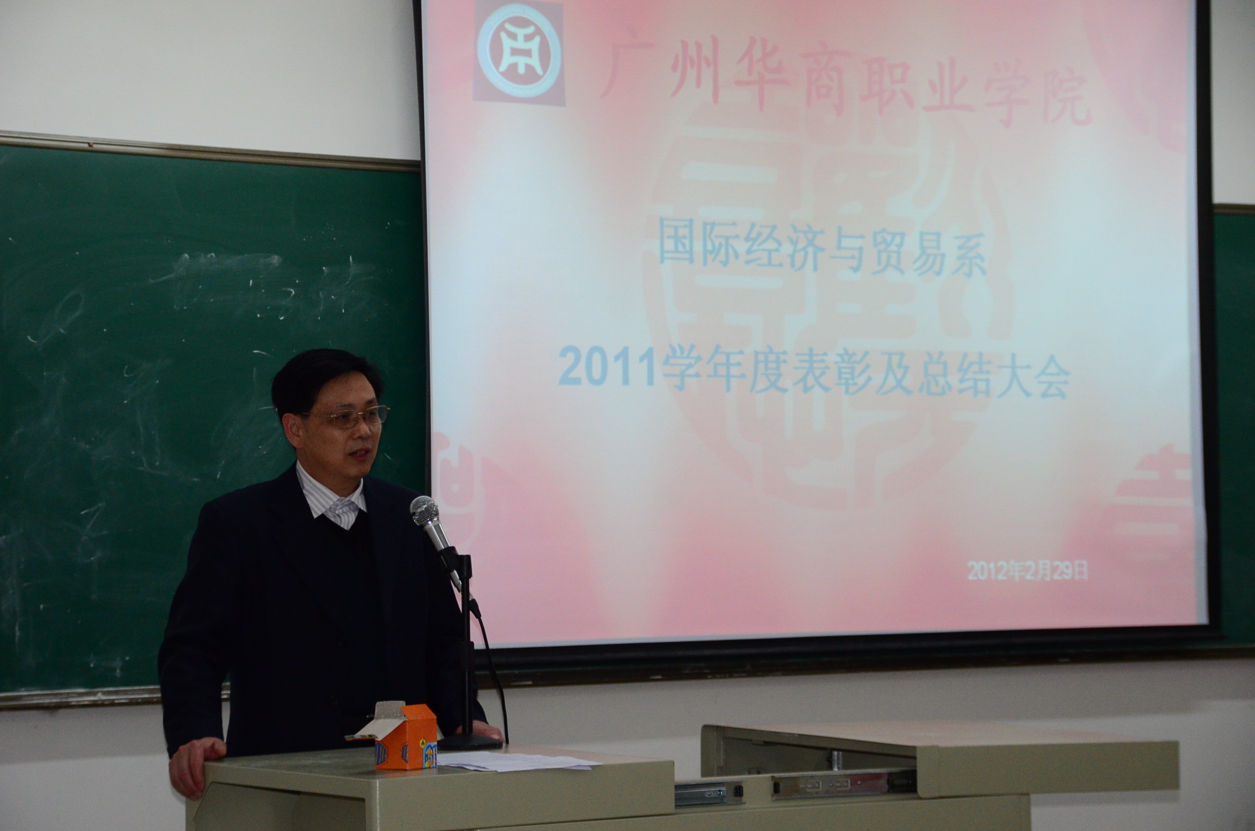 2012年2月29日晚7:30分,国际经济与贸易系在博学楼B207召开由系团总支学生会筹办的2011学年度学生工作表彰暨总结大会,特邀院党委黄桂标书记、院团委郭显磊书记、院团委指导老师何标老师,国贸系周岳梅主任、国贸系党支部书记潘虹老师、国贸系团总支学生会书记苏伟钧老师、副书记吴斯羿老师、辅导员潘飞静老师以及国贸系部分班主任出席了本次大会。大会由国贸系团总支学生会秘书处秘书长廖榕榕同学主持。