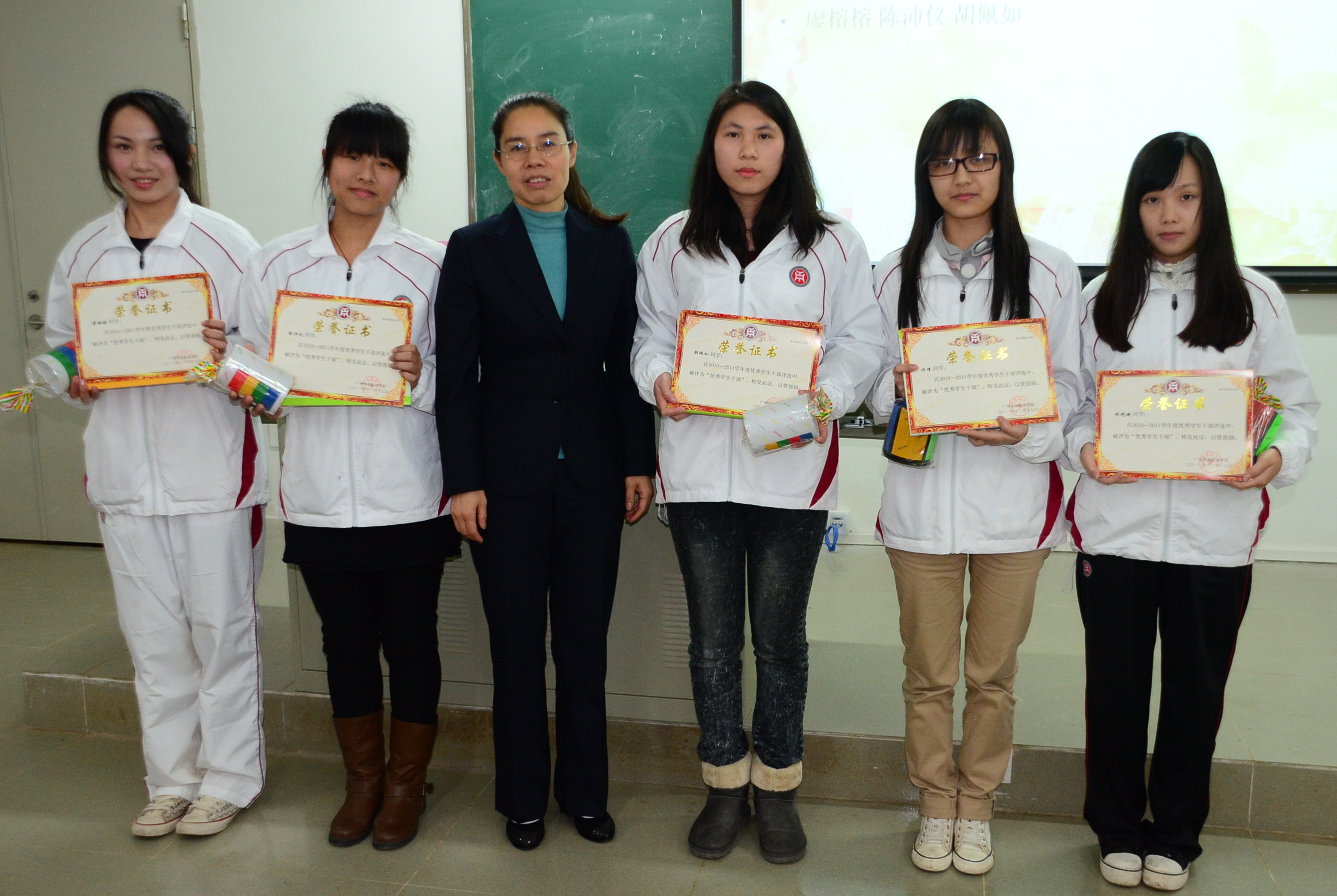 之后,随着进行曲的播放,以2011学年度第三届田径运动会获奖者35人,院、系、班优秀学生干部获得者7人,以及校级奖学金获得者19人等三项为主题内容的颁奖仪式浓重进行。院党委黄桂标书记、周岳梅主任、团委郭显磊书记分别为以上获得者颁发奖状及奖品。全场掌声如雷,气氛浓厚。
