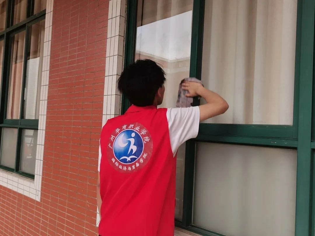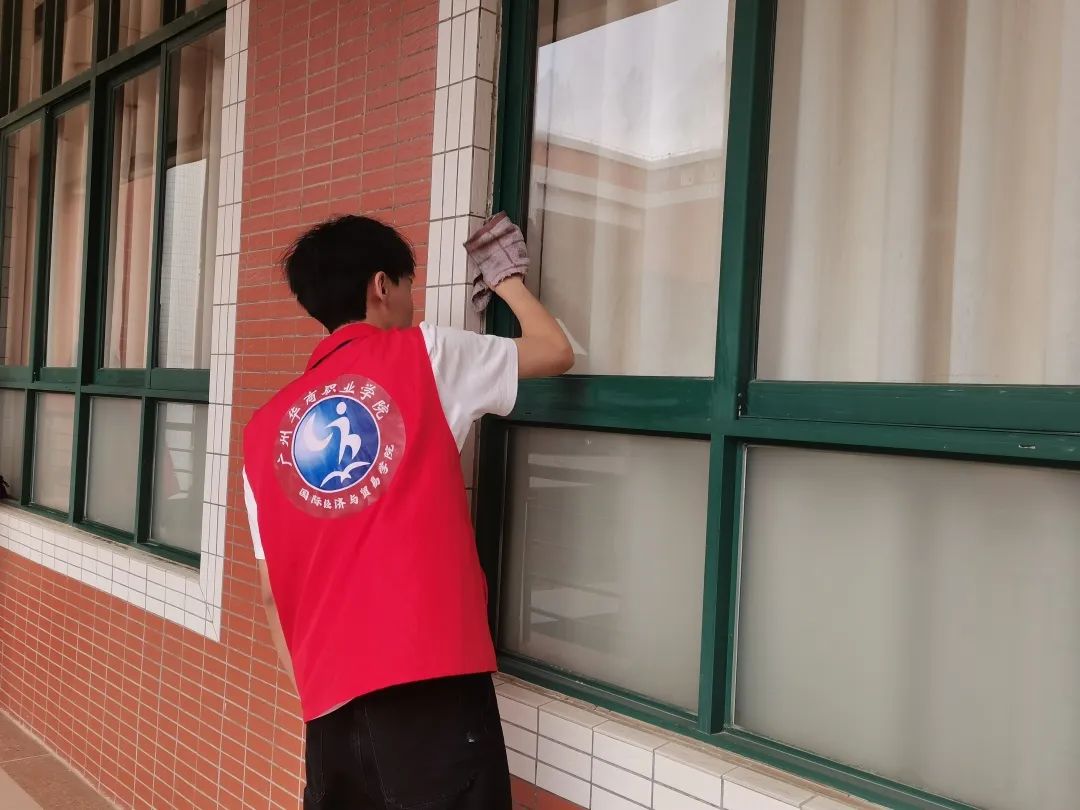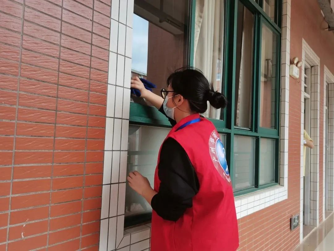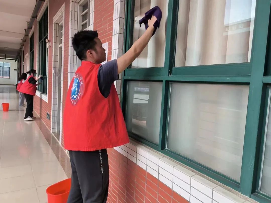 在工作人员的带领下,志愿者们以平凡和朴实的行动,不条不会紊地美化着课室、楼梯处的每一个角落。大家集中精力,清扫垃圾,擦拭黑板,清洁玻璃,使课室内外变得焕然一新。