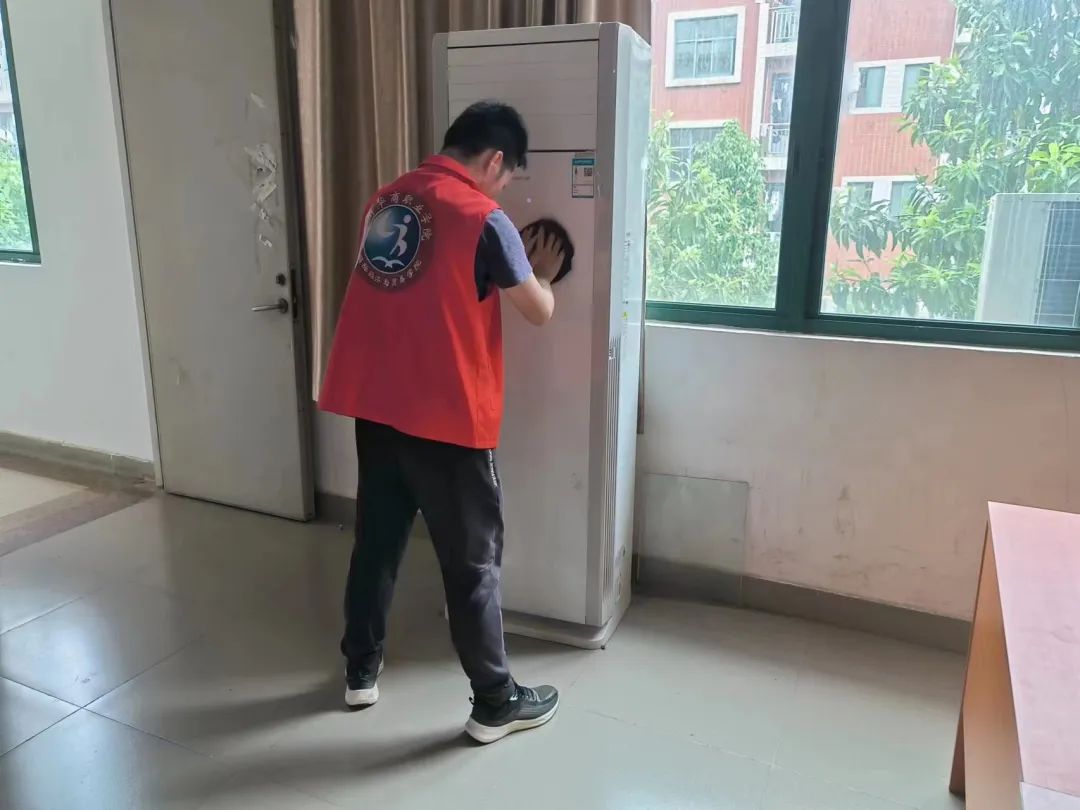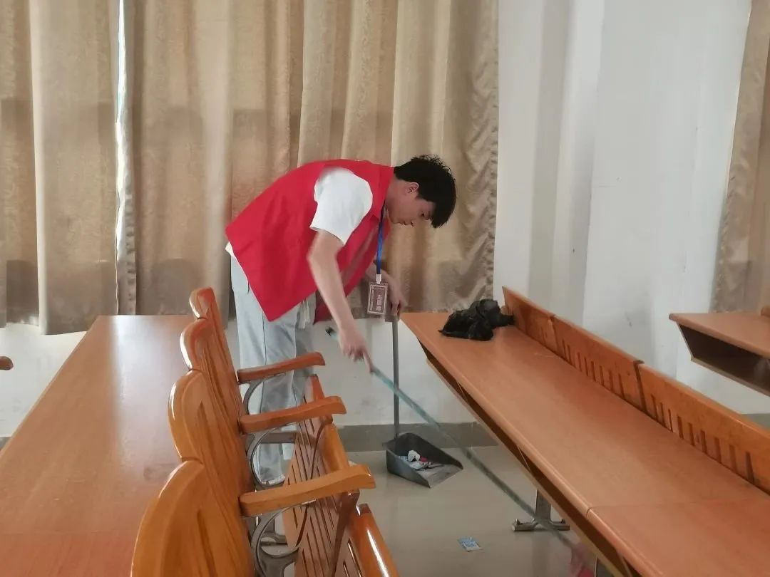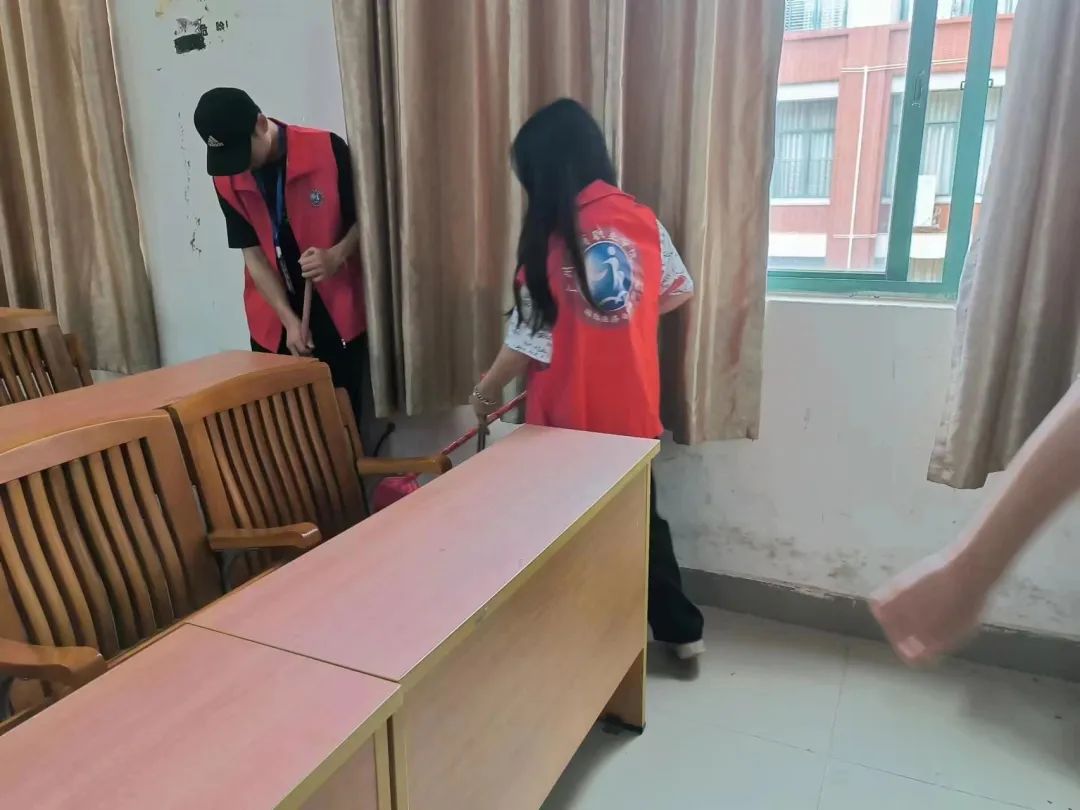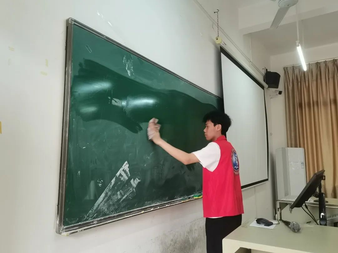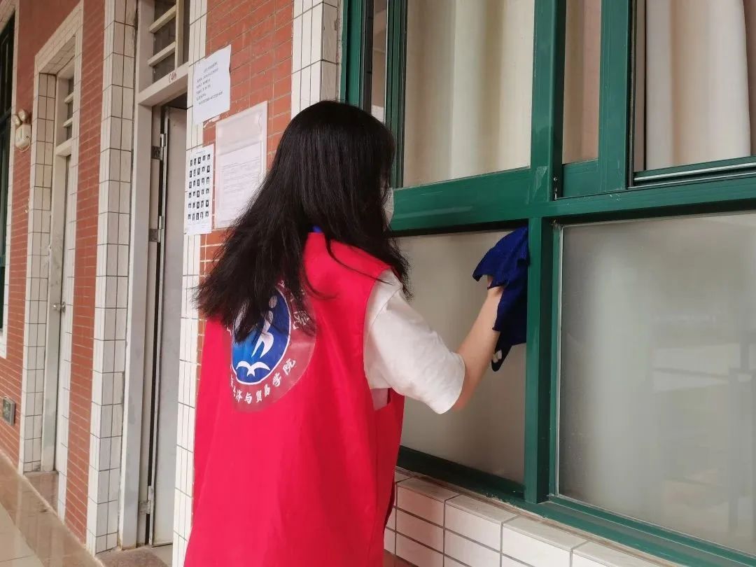 在工作人员的带领下,志愿者们以平凡和朴实的行动,不条不会紊地美化着课室、楼梯处的每一个角落。大家集中精力,清扫垃圾,擦拭黑板,清洁玻璃,使课室内外变得焕然一新。
