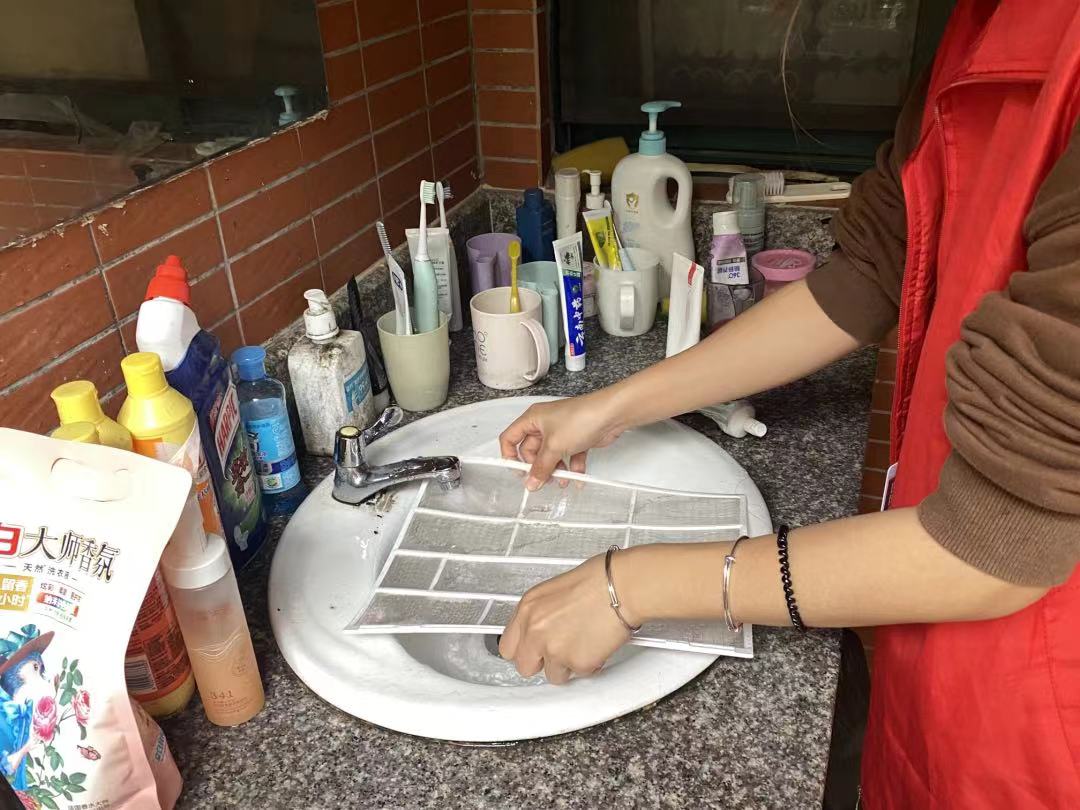 活动前期,负责人与志愿者们细致地讲解了清洗空调的注意事项和流程步骤。在掌握基本的操作要点后,他们分工明确、有序进行,小心翼翼地打开空调机盖,用刷子、清洁剂和毛巾将滤网擦拭的焕然一新。