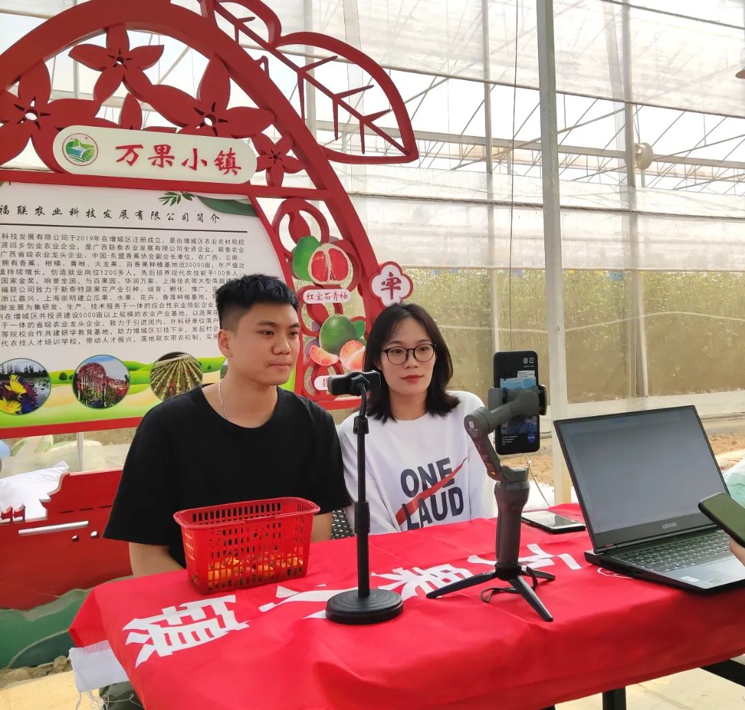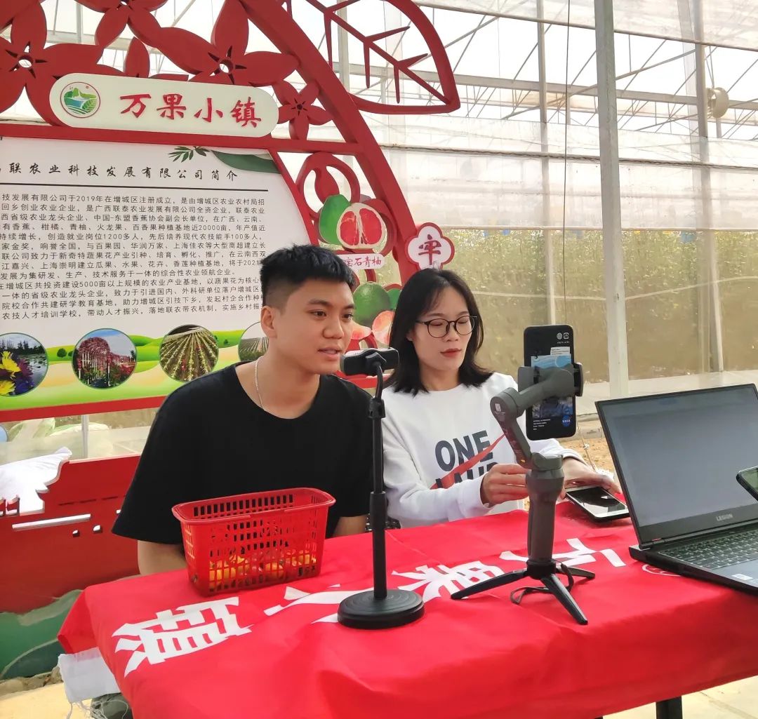 自团队组建以来,同学们发挥专业特长,整合自身资源融入乡村振兴发展的战略,运用网络新媒体,以直播带货等形式拓宽农产品销售渠道,推广万果小镇的特色品牌,助力其特色农业发展。