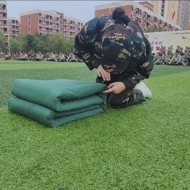 参赛人员争分夺秒,认真细致,“展、折、切、压、捏、抠”不一会儿,一床棱角分明、整齐划一的被子展现在大家面前。在一掏一拉、一捏一抠的细微之举中磨练意志,培养耐心。