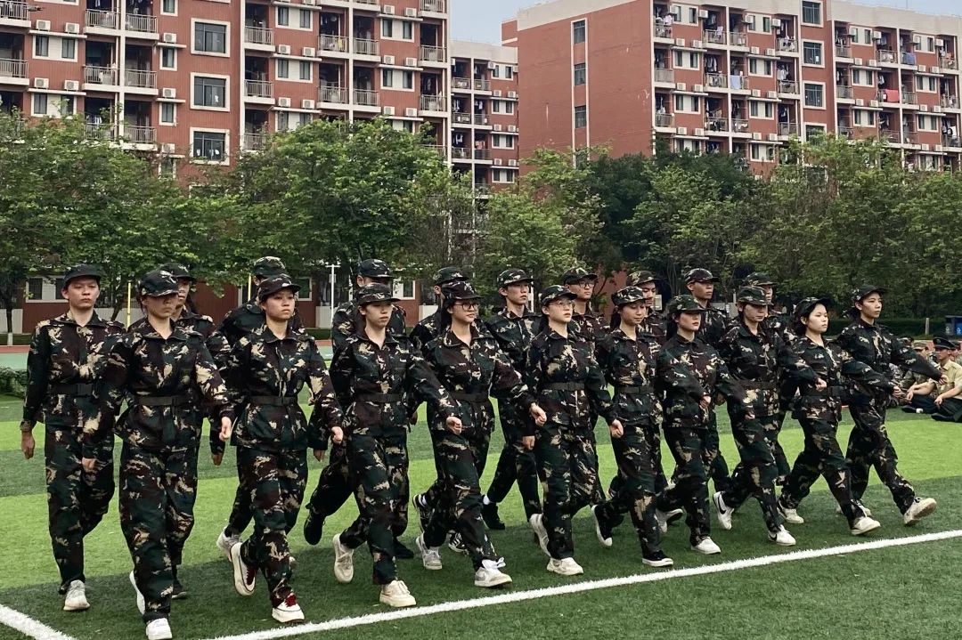 同学们整齐的步伐器宇轩昂,嘹亮的口号国贸学子,团结拼搏,不怕困难,超越自我,势破云霄,坚毅的步伐进一步展现了同学们良好的军事素养和昂扬的精神风貌。