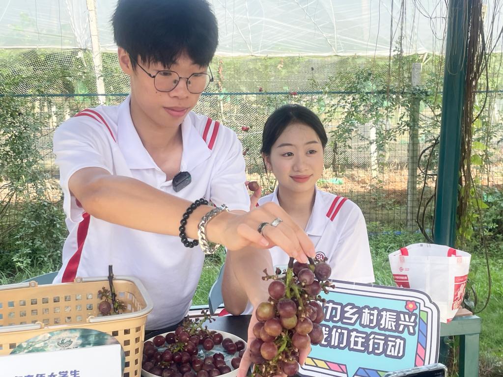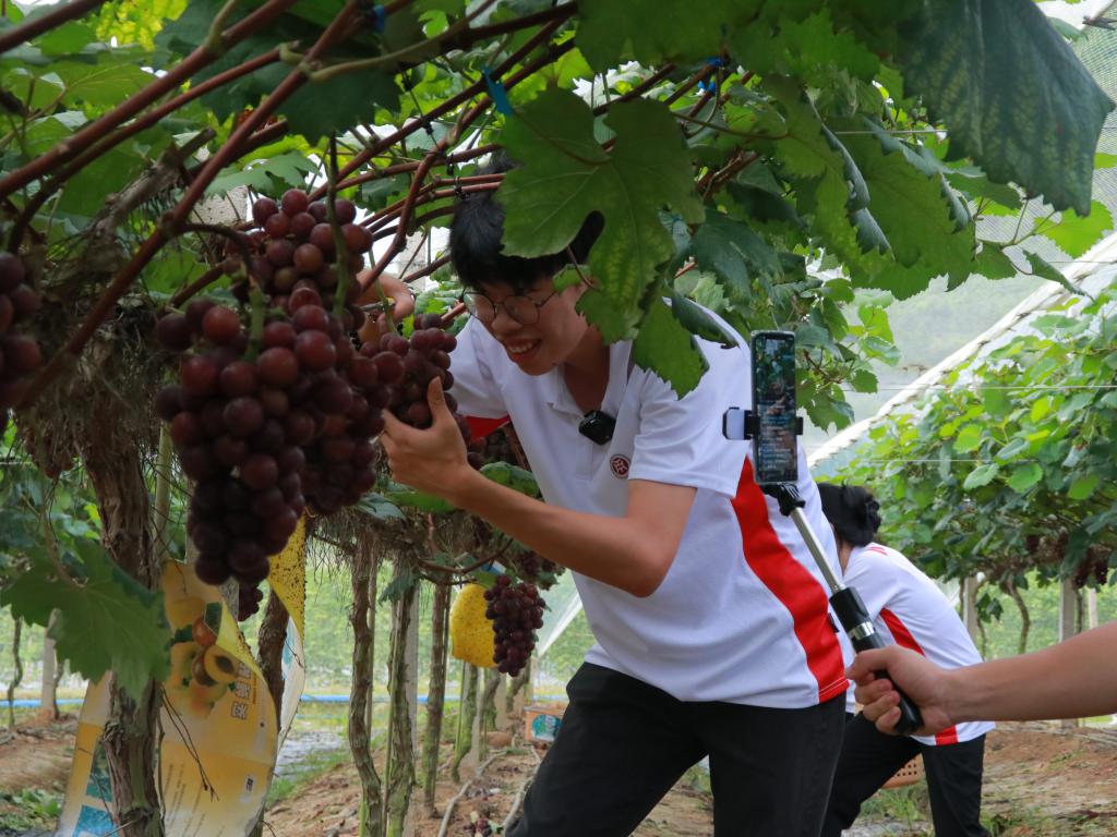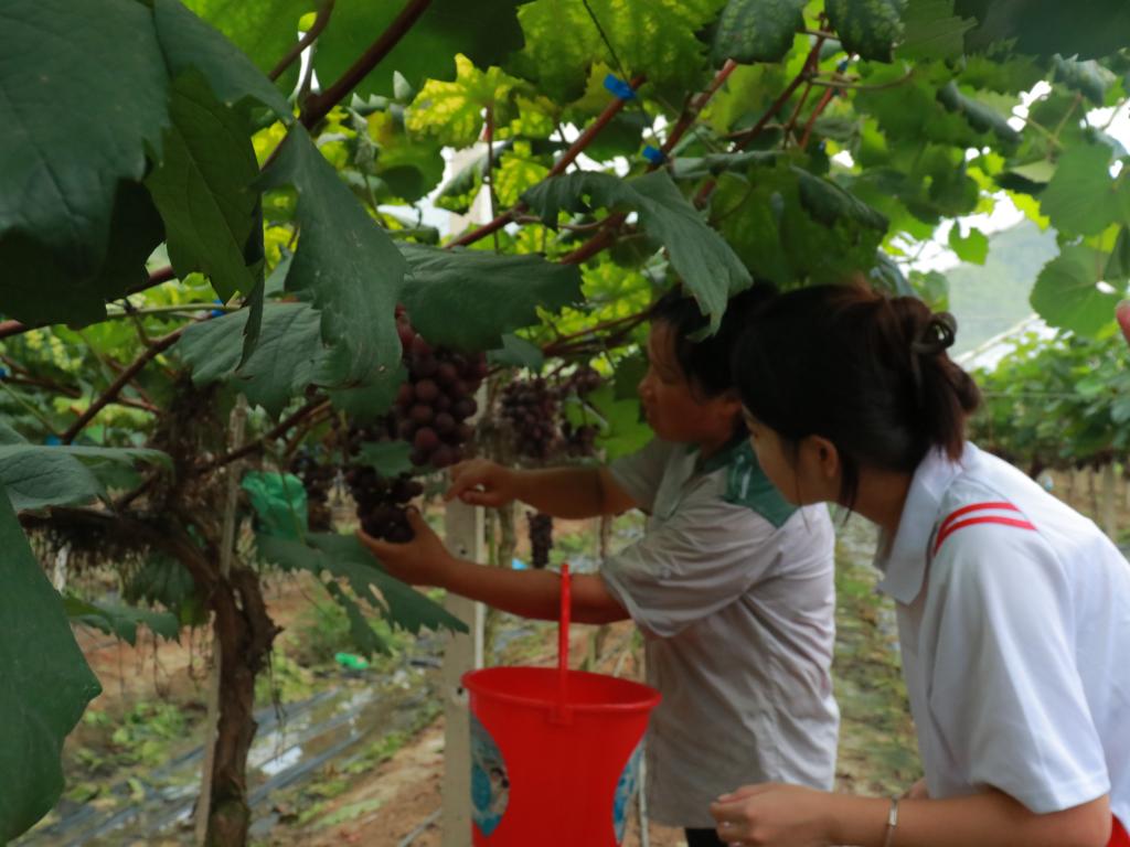 藤上缀满了熟透的葡萄,一串串葡萄在阳光的映照下散发着诱人的光泽。如今,正值夏黑葡萄上市之季。在农场负责人的引领下,实践团踏上采摘之旅。负责人向实践团队员示范采摘步骤,并叮嘱在采摘过程中务必轻拿轻放。