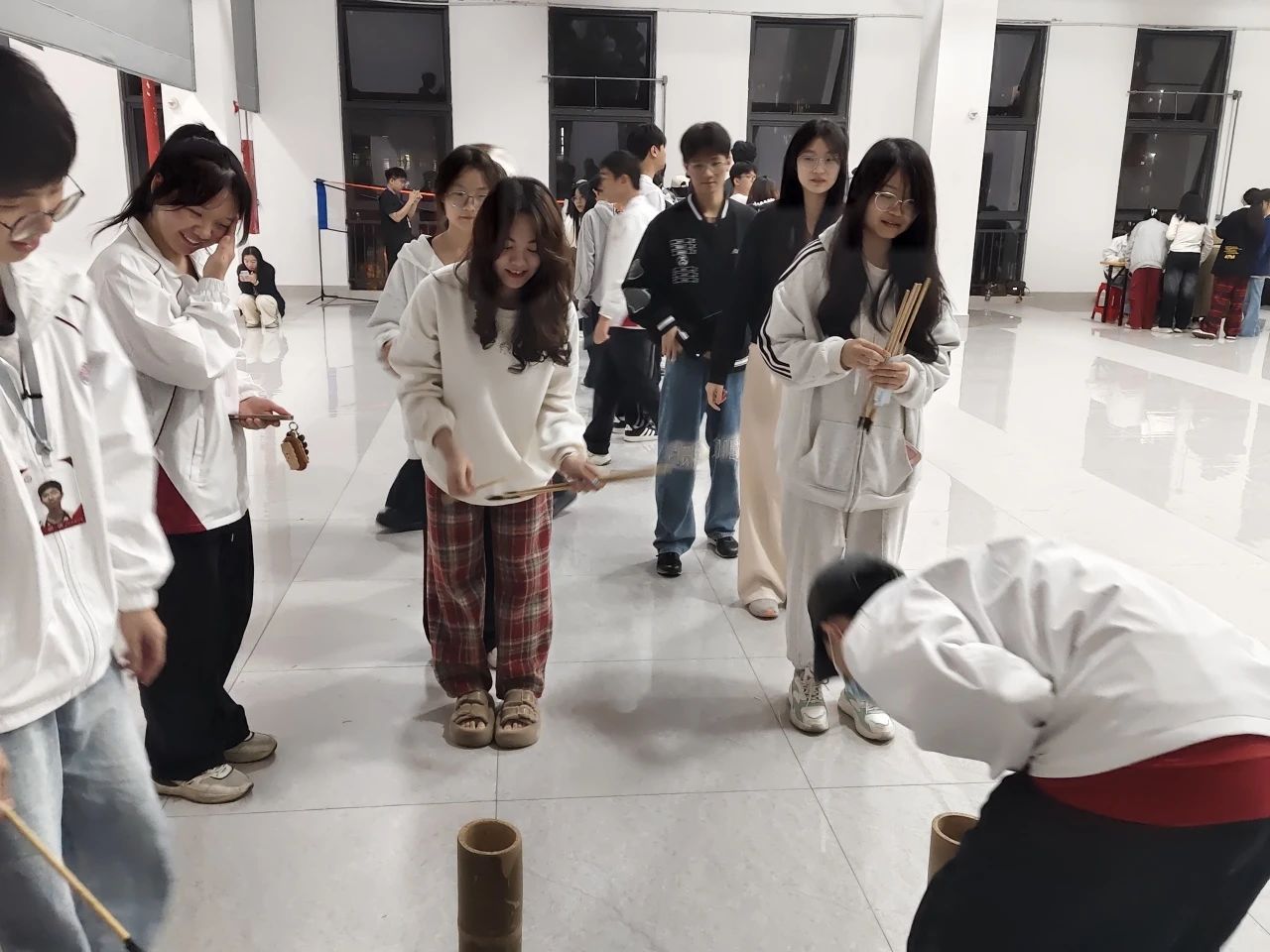 介绍完毕,活动开始,本次活动项目有看字识色,爱的飞行日记,表情扑克牌,趣味投壶,心理健康知识科普答题,心理素质拓展活动--珠行千里。活动过程中,同学们积极参与活动,现场气氛热烈非凡。在开场的破冰游戏里,大家迅速打破隔阂,欢声笑语回荡在整个场地。同学们勇敢地迈出了自己的舒适区。一起完成那些需要团队协作的任务时,大家深刻体会到了合作的力量。在这个过程中,同学们发现自己其实有很多潜力,共同克服困难,完成任务的那一刻,那种成就感和喜悦感油然而生,也让同学们明白了,很多时候,阻碍我们前进的不是能力,而是内心的恐惧。