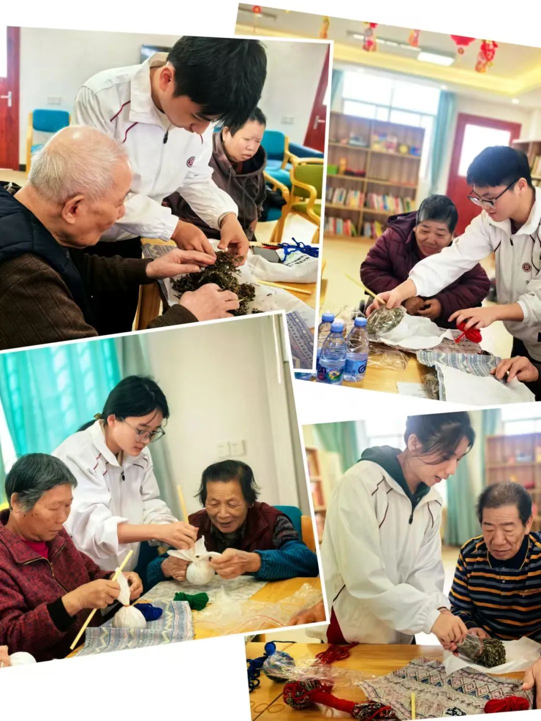 志愿者们经过培训之后,制作开始,志愿者率先示范,轻轻梳理艾草,让叶片舒展又紧实,再将其妥帖裹进粗布,宛如给它穿上温暖“外套”,最后一圈圈绕上棉线,加固成型。老人们看得专注,上手时更是专注投入,手指穿梭在布料与棉线间,动作虽慢却满是笃定。志愿者们时刻注意老人们的举动,看见有不会的就立马上前指引;个别老人心灵手巧,还反过来教年轻志愿者如何把线缠得更美观,欢声笑语此起彼伏。