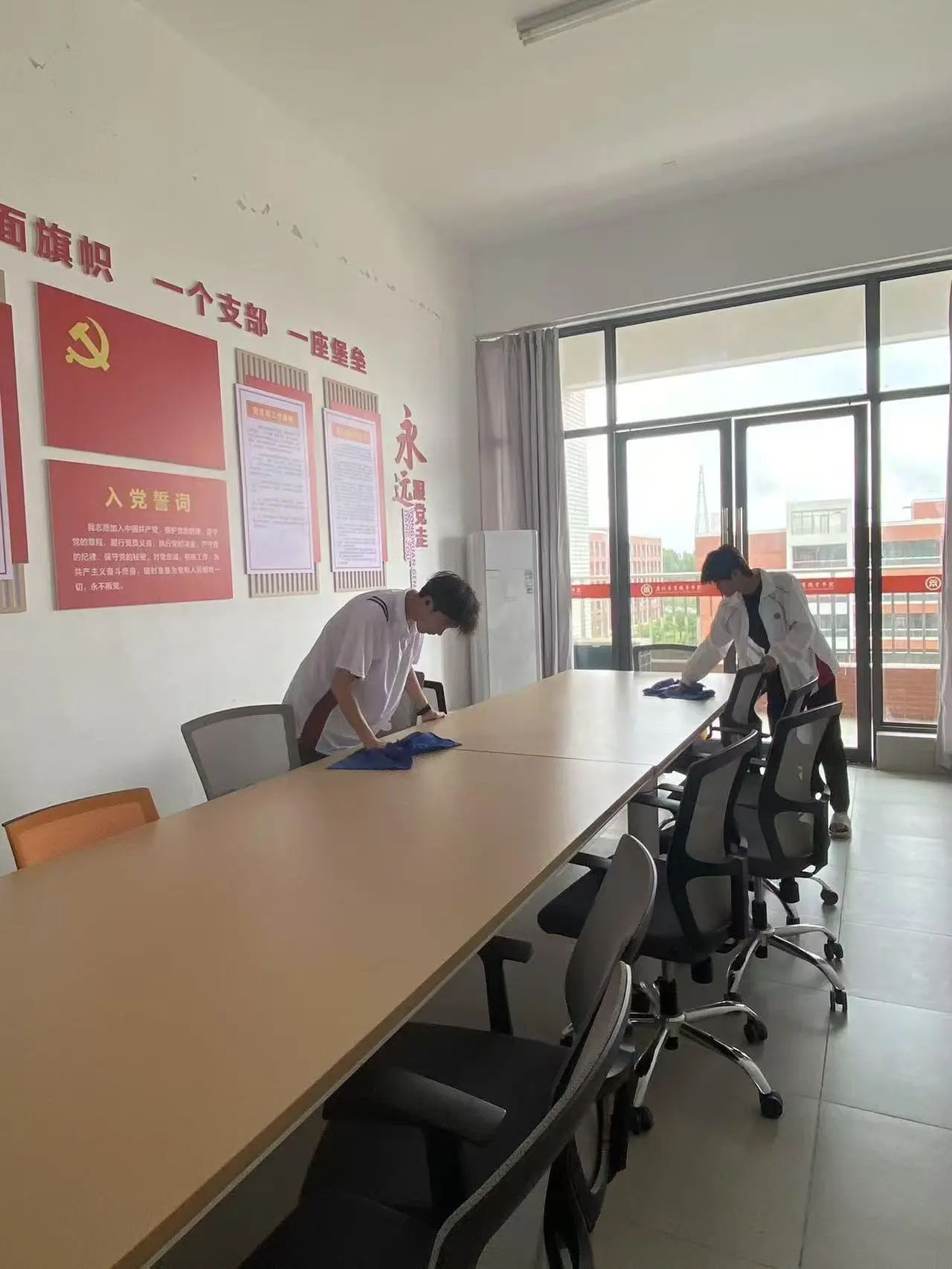 活动当天,入党积极分子们早早集合,手持清扫工具。明确分工后,大家迅速奔赴教室的每一个角落。清扫时,大家不怕脏累,专注于每项任务,在大家齐心协力的努力下,原本略显杂乱的教室焕然一新,干净整洁的桌面、明亮的窗户、一尘不染的地面,为同学们创造了更舒适的学习环境。