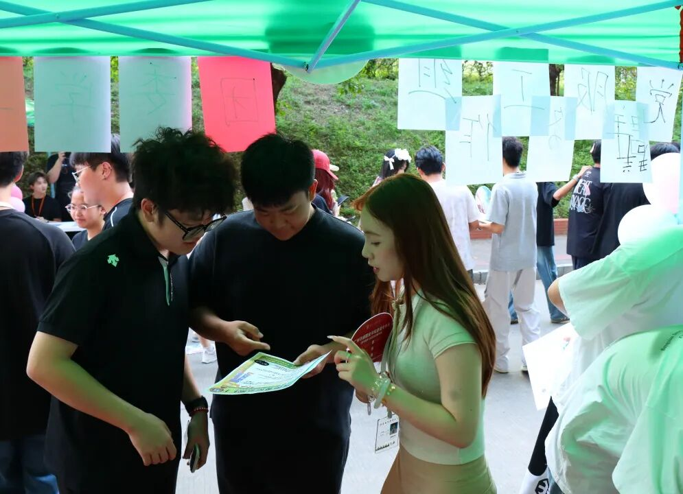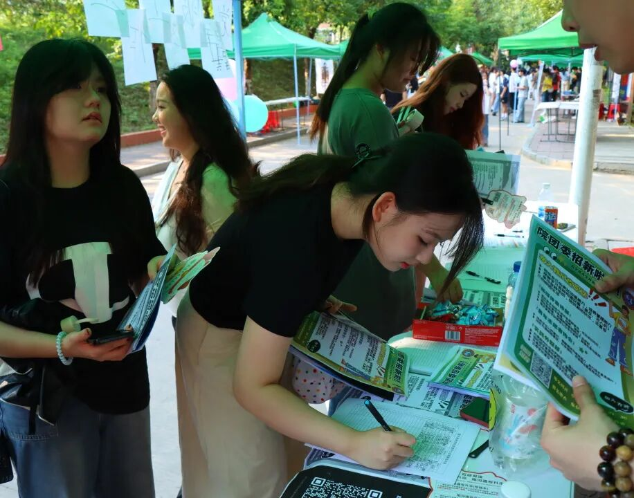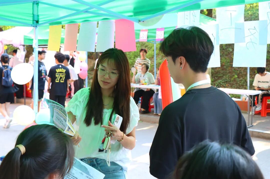 招新摊位在校道旁热闹铺开,各部门成员热情地跟新生们介绍讲解,让新生们对加入团委、学生会充满期待。