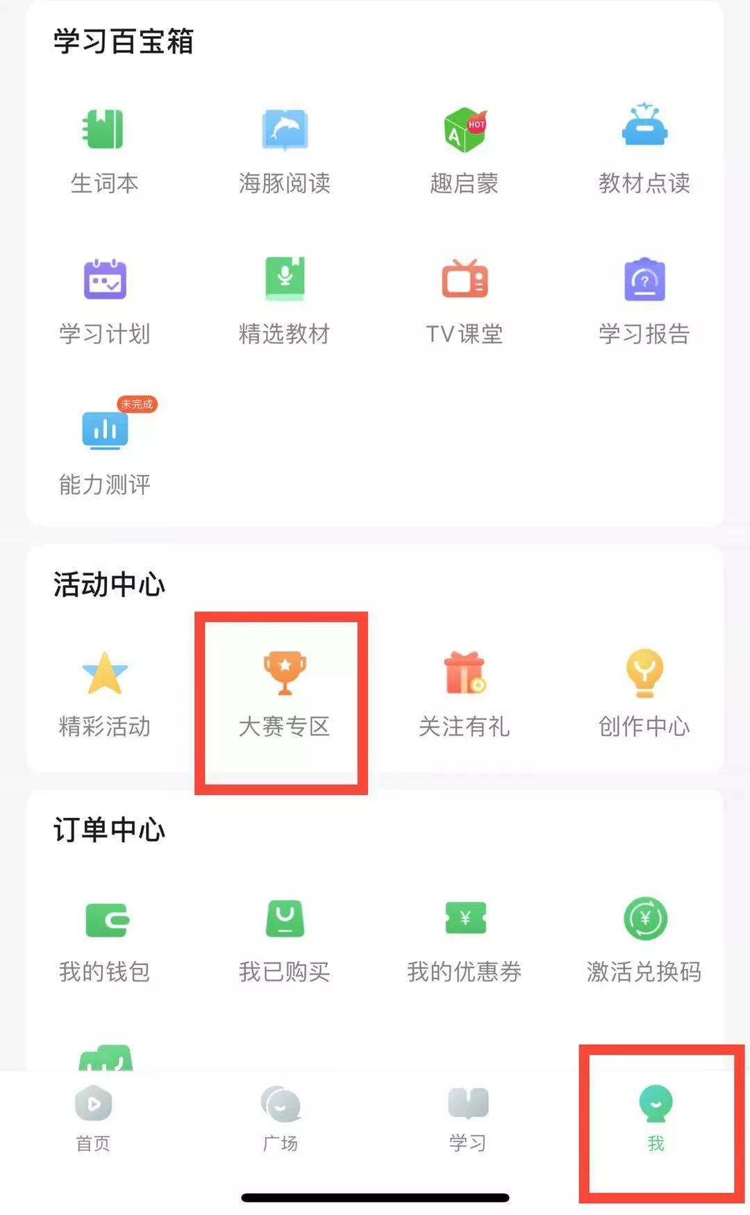 (2)点击右下角“我”,在“活动中心”找到“大赛专区”,点击进入。