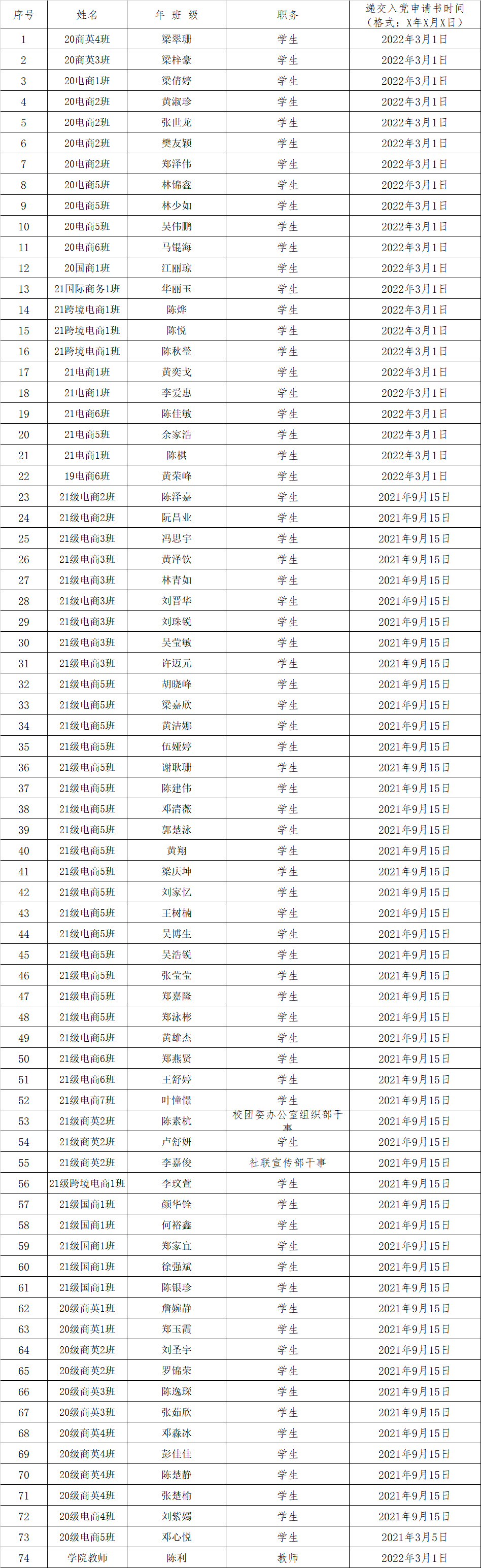 此次授课以线上的方式进行了党的基本知识教育,为同学们讲述了中国共产党的发展史,向同学们传递了中国共产党的核心价值观、如何成为一名合格的共产党员等。下面是本期的初级党课结业名单: