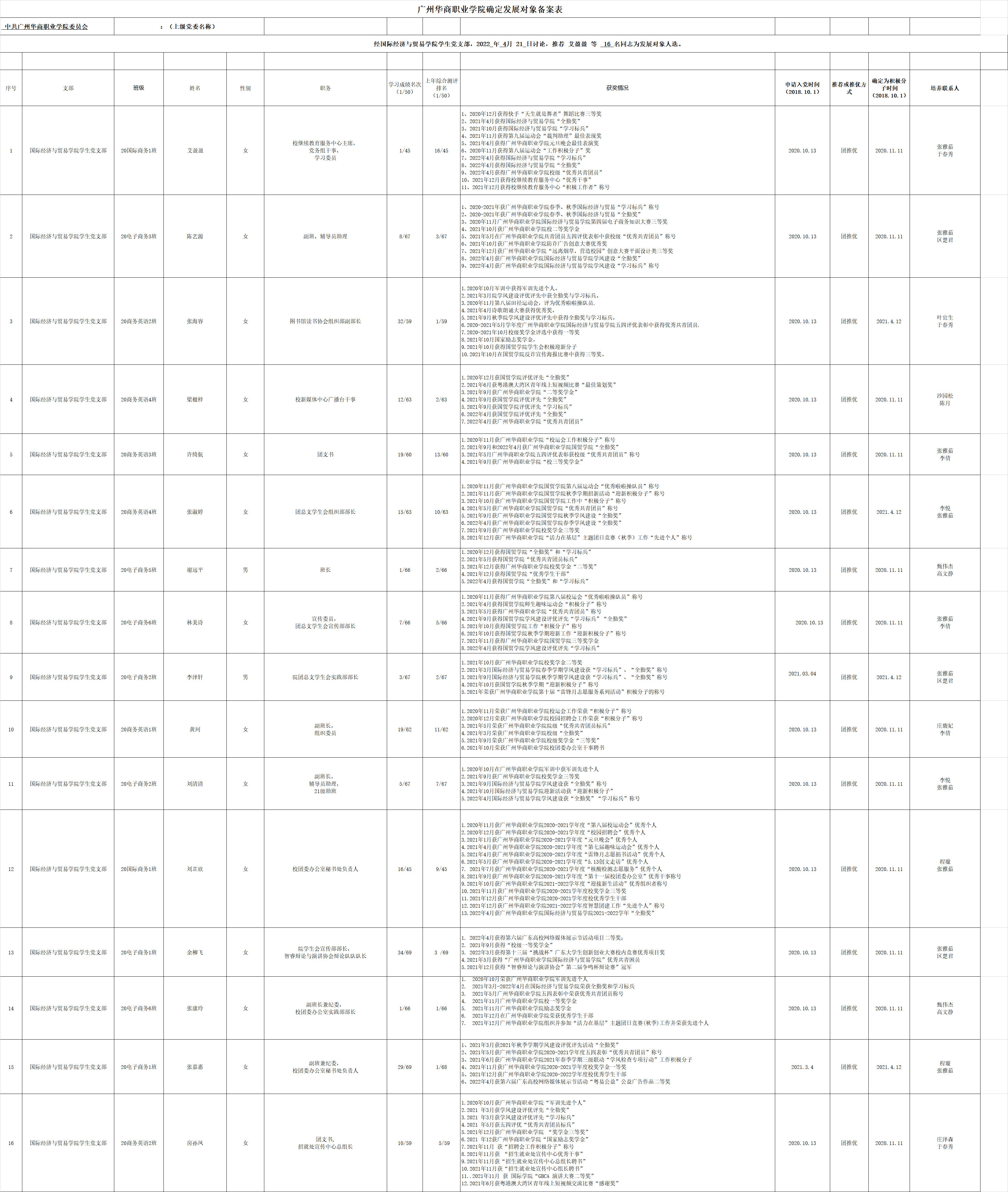 经国际经济与贸易学院学生党支部研究,报学院党总支审核,我院拟推荐艾盈盈等16名同志为党员发展对象(具体名单见附件)。现将有关情况予以公示。公示期为2022年4月21日-2022年4月27日。如对公示情况有异议,请在公示期内以电话或书面的形式向国际经济与贸易学院党总支反映。