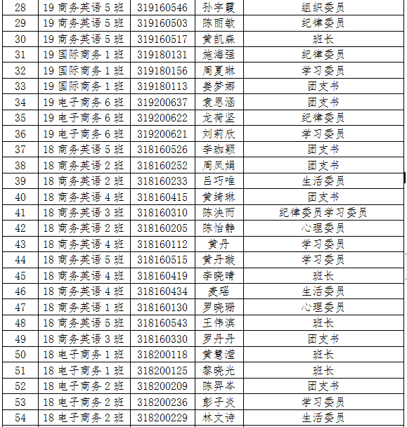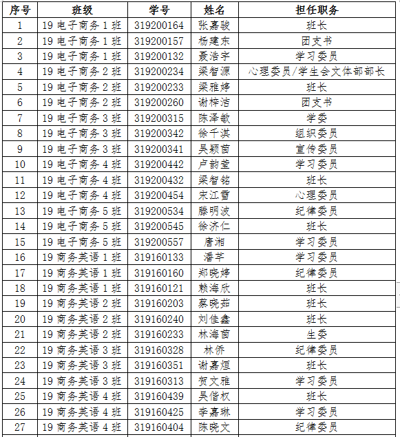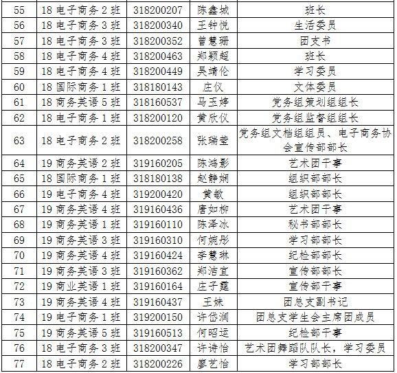按照《国际经济与贸易学院关于评选2019-2020学年优秀学生干部的通知》[2020]23号文的要求,为鼓励我院学生干部认真履职、创先争优,充分发挥榜样示范作用,通过充分酝酿、评议推荐、投票选举、征求意见等民主程序,经学院研究决定授予张嘉骏等77名同学“国际经济与贸易学院2019-2020学年优秀学生干部”荣誉称号(详细名单见下表)。