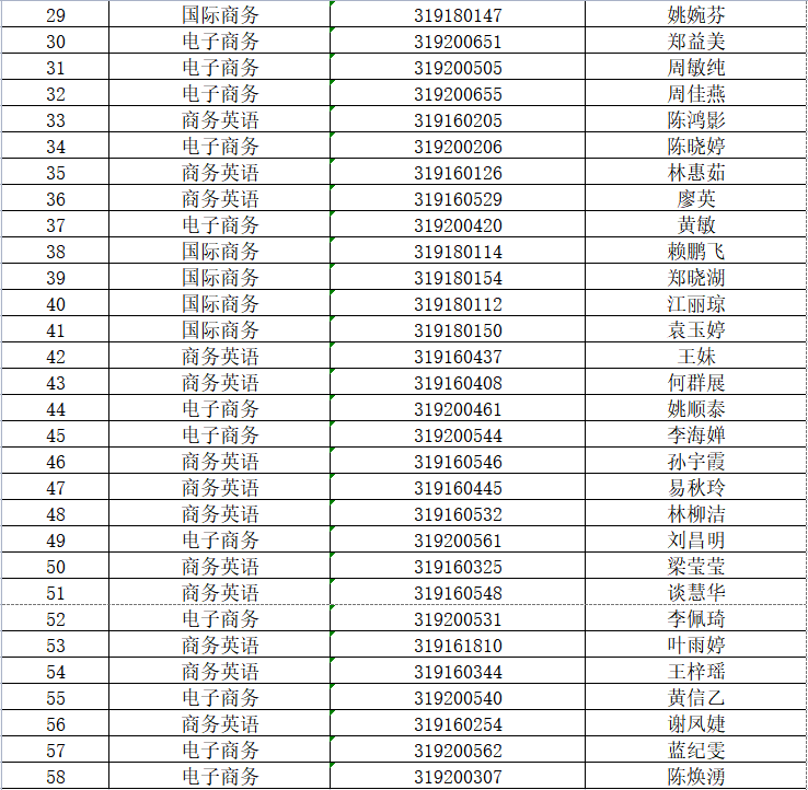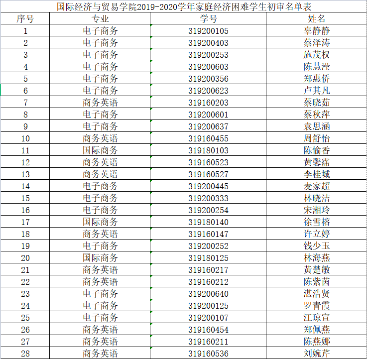 按照《广东省教育厅关于做好2019年秋季学期学生资助工作的通知》文件精神,结合我院实际情况,本着“公开、公平、公正”的评选原则,经学生本人申请、班级推荐、学院国家奖助学金评审小组评审,共有辜静静等58名学生通过国际经济与贸易学院2019-2020学年国家家庭经济困难学生初步审核(具体名单见附件),现予以公示,如有异议,请在公示期间向学院负责老师反映。