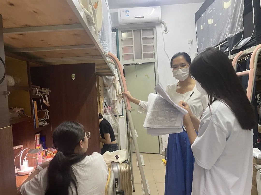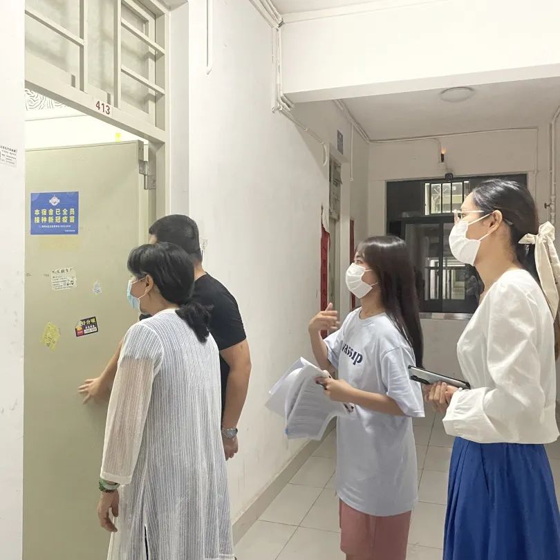 2022年9月29日晚上,国际经济与贸易学院梁悦院长、党总支吴仕坚副书记、新生辅导员莫桂遇老师、张智敏老师以及新生辅导员助理进行宿舍走访,了解新生的入住情况,并强调了国庆假期注意事项、宿舍安全注意事项。