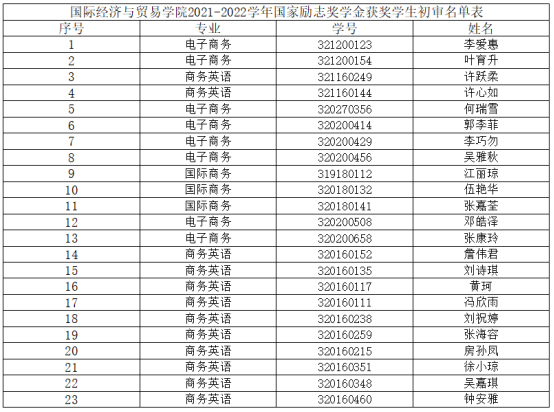 按照《广东省教育厅关于做好2022年秋季学期学生资助工作的通知》文件精神,根据我校华商职学{2022}38号相关文件要求,结合我院实际情况,本着“公开、公平、公正”的评选原则,经学生本人申请、班级推荐、学院国家奖助学金评审小组评审,共有李爱惠等23名学生通过国际经济与贸易学院2021-2022学年国家励志奖学金初步审核(具体名单见附件),现予以公示,如有异议,请在公示期间向学院负责老师反映。