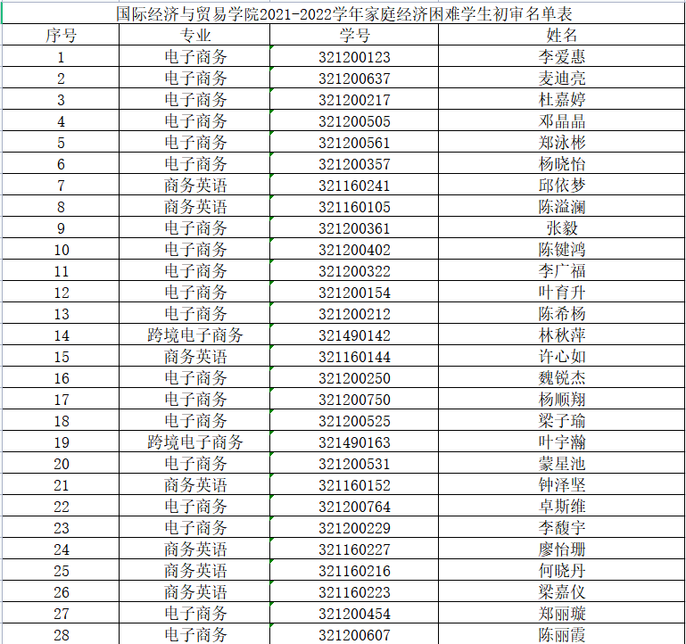 按照《广东省教育厅关于做好2021年秋季学期学生资助工作的通知》文件精神,结合我院实际情况,本着“公开、公平、公正”的评选原则,经学生本人申请、班级推荐、学院国家奖助学金评审小组评审,共有李爱惠等37名学生通过国际经济与贸易学院2021-2022学年家庭经济困难学生初步审核(具体名单见附件),现予以公示,如有异议,请在公示期间向学院负责老师反映。