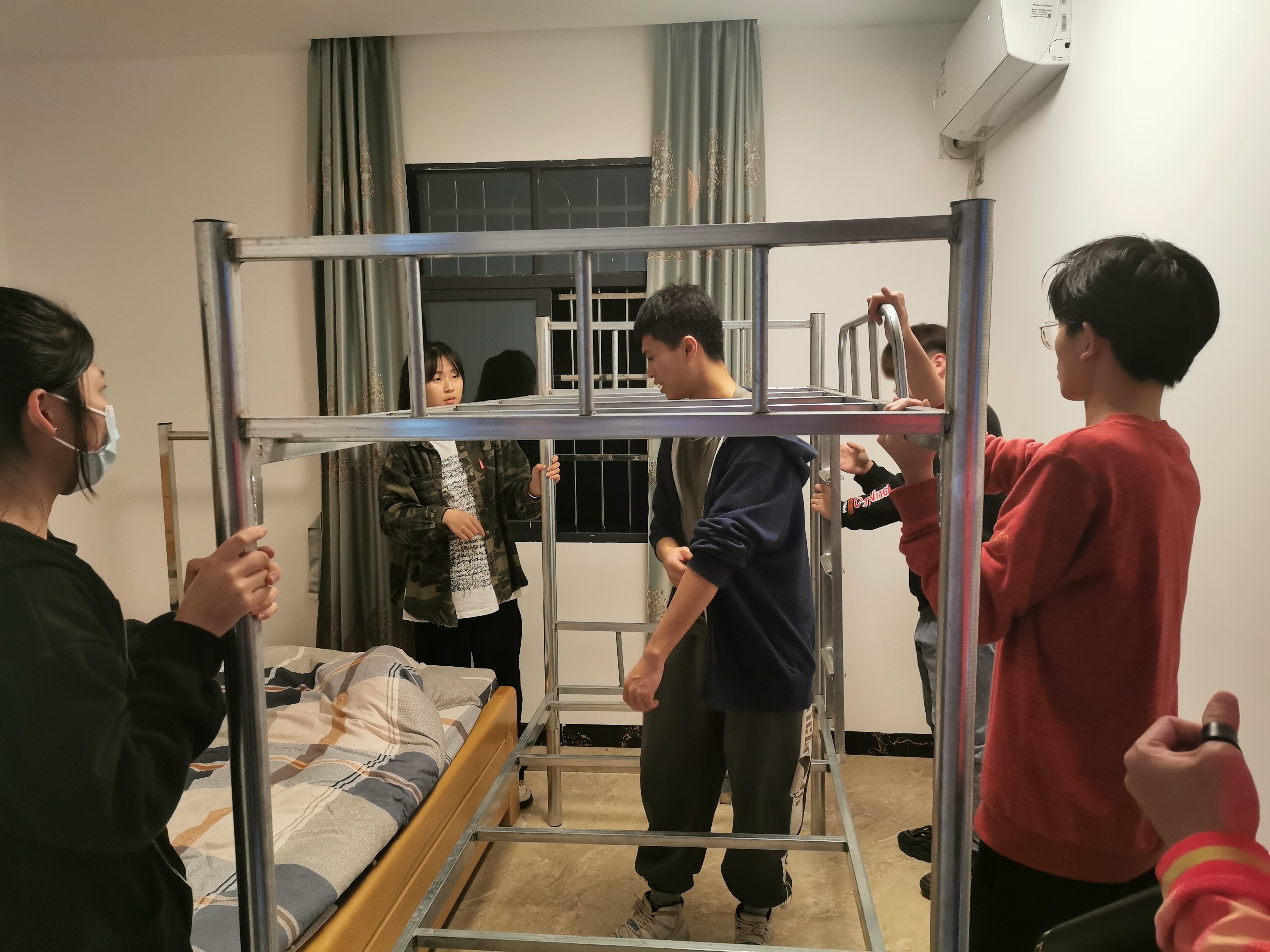 随后,同学回到住的地方,开始收拾房间,组装床铺,同学们之间相互帮忙,很快就将东西收拾好了。