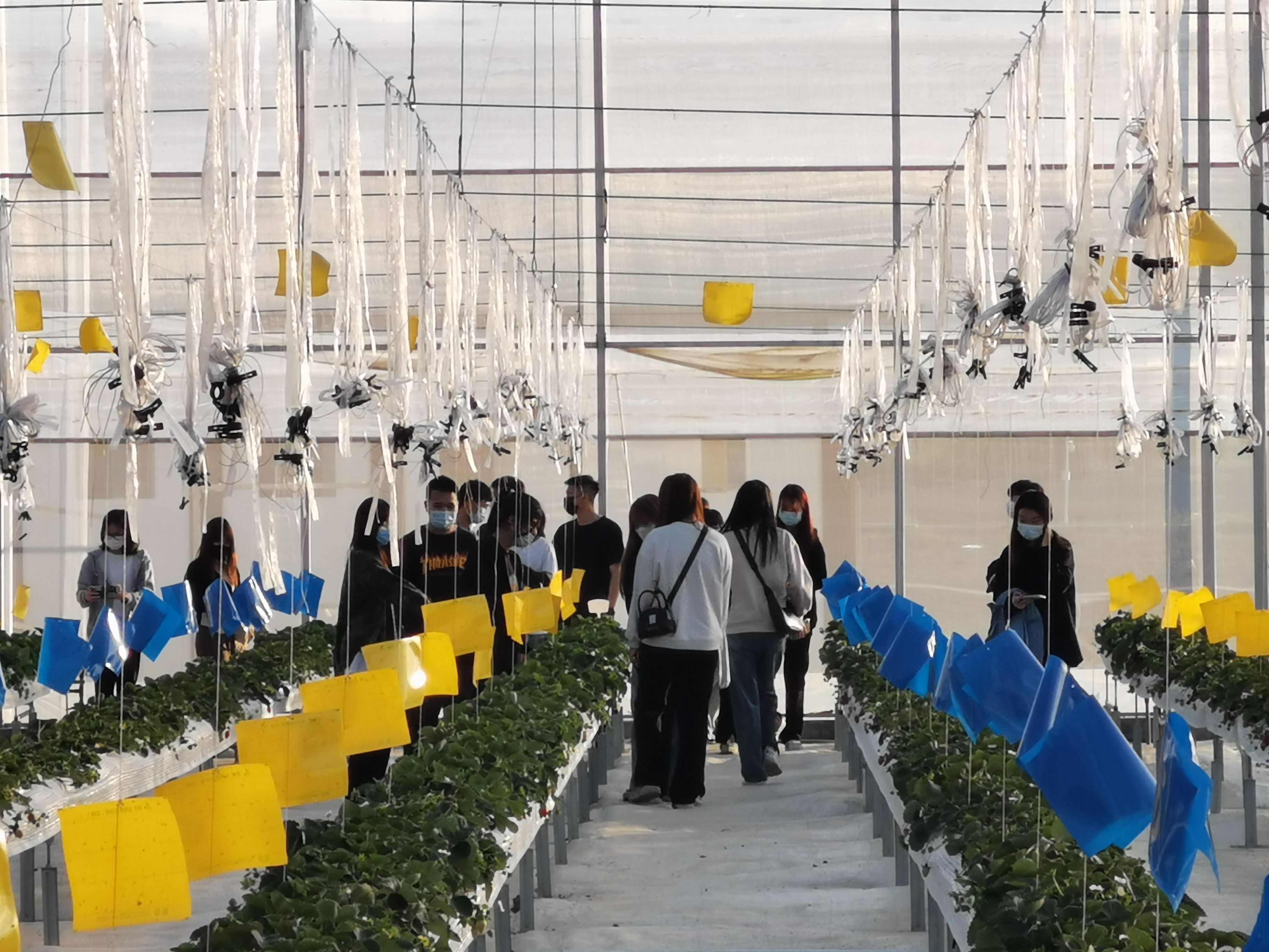 下午四点多,经过1个多小时的车程,终于来到了万果小镇,助农直播社会实践服务团队的同学们将要在这里进行为期10天的志愿服务活动。我们到达万果小镇后,由万果小镇的伍经理带领我们进行了参观。首先,我们参观了草莓采摘园和番茄采摘园,看到精准管理下水果更加的鲜艳诱人,引得同学们声声感叹,接着,我们又来到火龙果、柑橘种植基地,看到规模化、科学化管理模式下的水果种植,让同学们大开眼界。伍经理还给同学们讲述了部分万果小镇的发展历程,从无到有,从小到大,万果小镇将会发展的更好,也希望同学们能将自己所学的专业知识运用到实践中,发挥专业力量,让更多人知道万果小镇及科学化的种植模式。