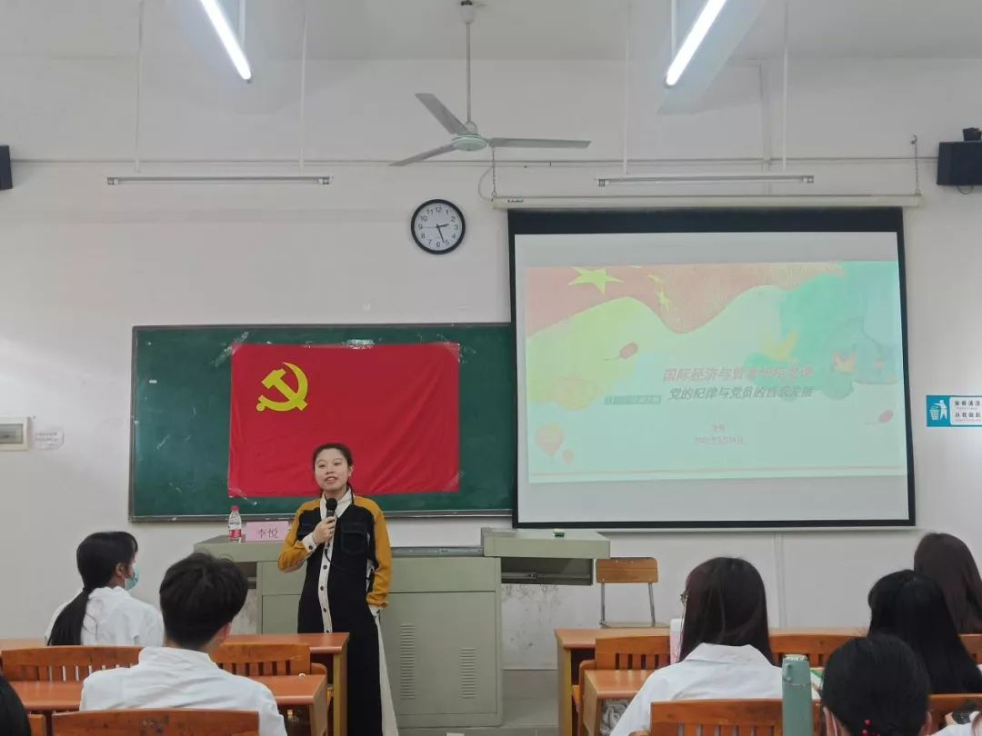 李悦老师通过互动交流的方式,以违纪党规纪律的典型例子,警示在座的同学们要严格遵守党的纪律,端正自己的思想与行为,注重自己的一言一行,不随波逐流,不讨论不传播不实政治言论。同时鼓励同学们要努力提高自身的专业技能和综合素质,以加入中国共产党为目标,以党员的高标准要求自己,争做学生榜样!