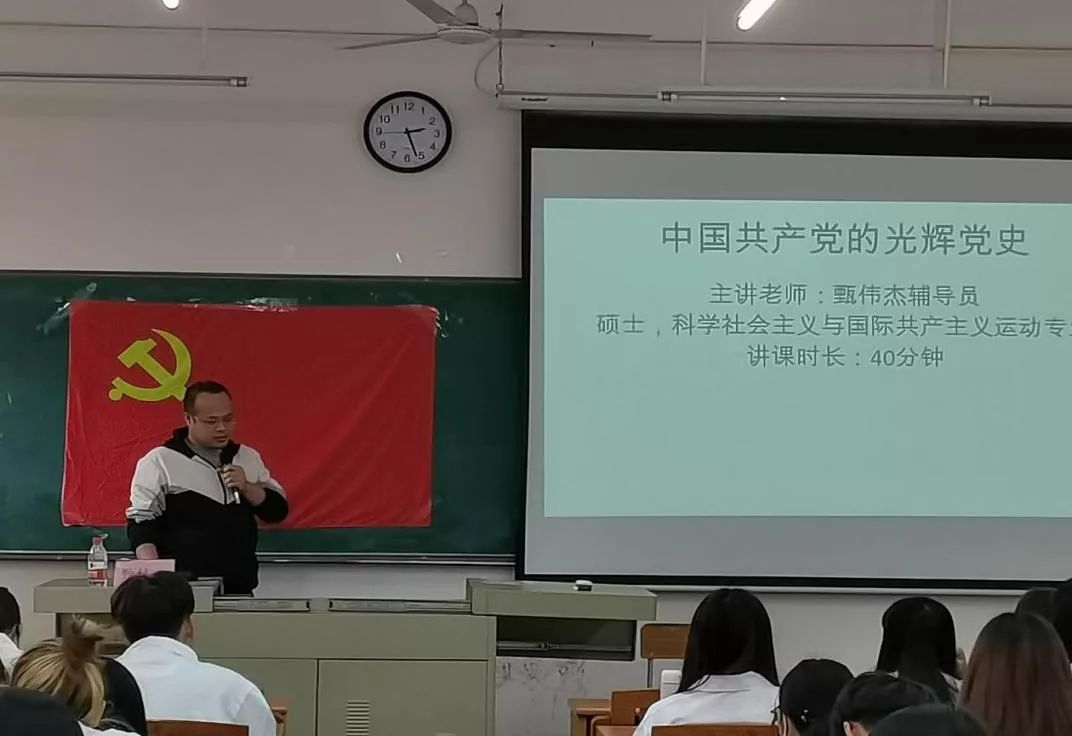 甄伟杰老师通过讲述时事热点中美高层战略对话带领同学们重温党史,接着通过党的十九大报告中所提出的伟大斗争、伟大工程、伟大事业以及伟大梦想四个方面,以及党的最新方针政策向同学们展开了详细的论述,最后甄伟杰老师希望同学们学好本领,早日加入中国共产党,真正成为国家的接班人,为国家的建设贡献出自己的力量。