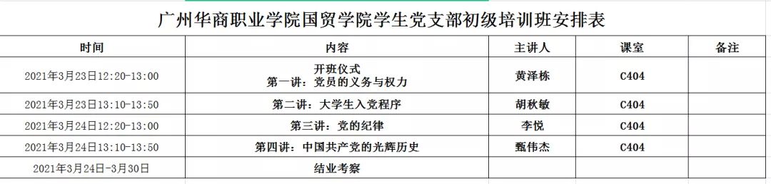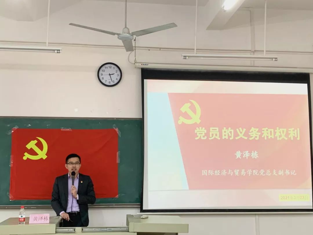 为进一步提高学生的党性修养,加深学生对党的基础知识的认识。国贸学院学生党支部分别于2021年3月23日、3月24日中午12点20分,在博学楼C404举行初级党课系列讲座。党课主讲人分别是国贸学院党总支黄泽栋副书记,学生党支部胡秋敏书记,纪检委员李悦老师,组织委员甄伟杰老师。参加此次培训的为19级、20级递交入党申请书的同学。