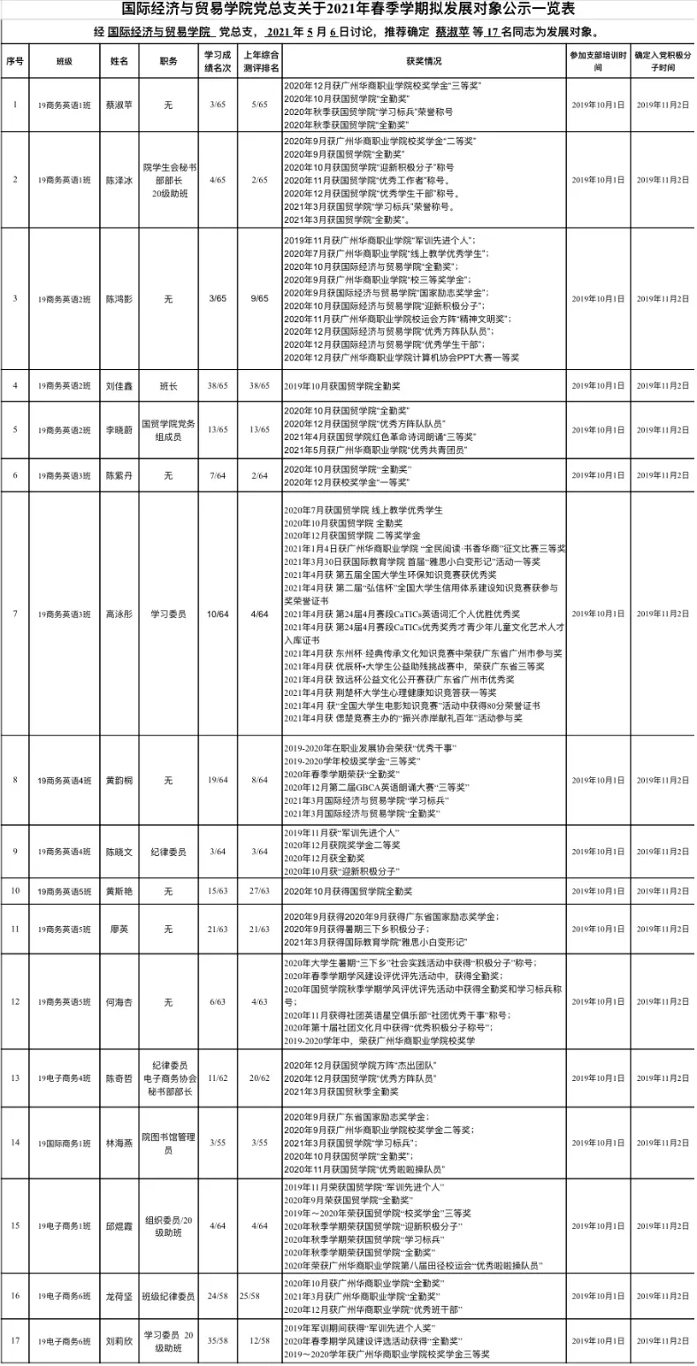 经国际经济与贸易学院学生党支部研究,报学院党总支审核,我院拟推荐蔡淑苹等17名同志为党员发展对象(具体名单见附件)。现将有关情况予以公示。公示期为2021年5月6日-2021年5月10日。如对公示情况有异议,请在公示期内以电话或书面的形式向国际经济与贸易学院党总支反映。