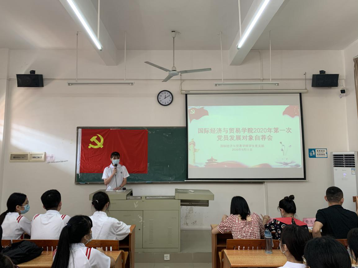 为做好党员发展工作,严格党员发展程序,为党注入新鲜血液,2020年9月11日中午12:10,国际经济与贸易学院学生党支部在博学楼C406召开2020秋季学期第一次党员发展对象自荐会。出席本次会议的有国际经济与贸易学院学生党支部胡秋敏书记、教工党支部黄志辉书记,学生党支部黄炬岱副书记、纪检委员李悦老师、辅导员甄伟杰老师,34名入党积极分子参加本次自荐会,会议由马玉婷同学主持。