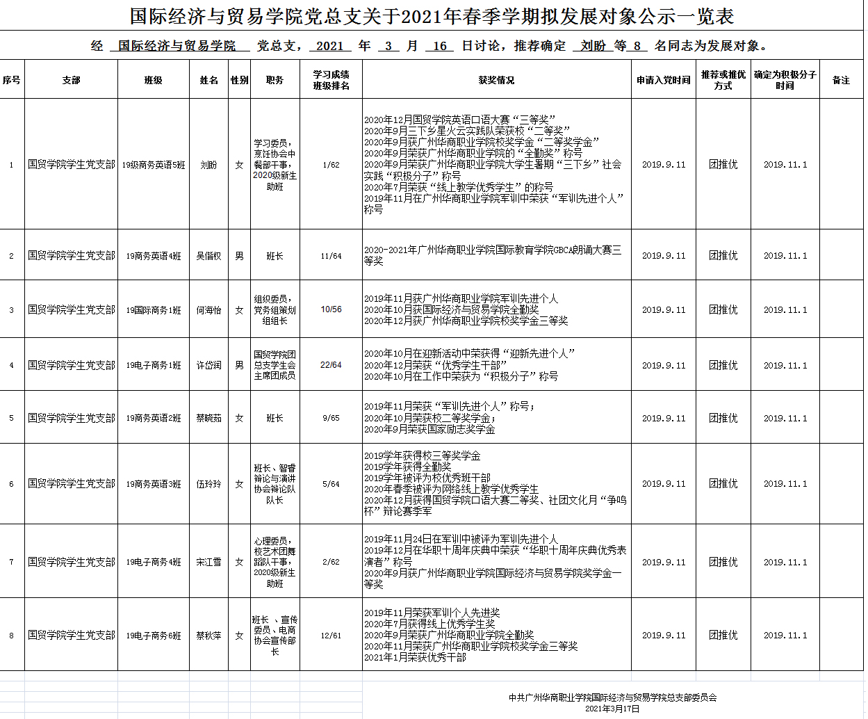 国际经济与贸易学院学生党支部研究,报学院党总支审核,我推荐刘盼等8名同志为党员发展对象(具体名单见附件)。将有关情况予以公示。公示期为2021317-2021321日。如对公示情况有异议,请在公示期内电话或书面的形式向国际经济与贸易学院党总支反映。