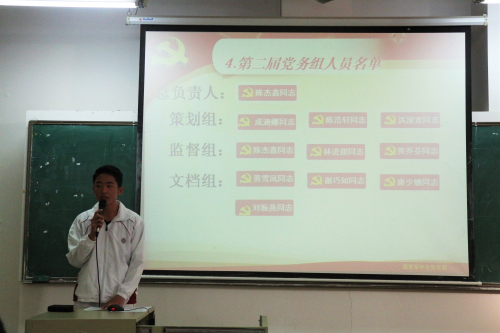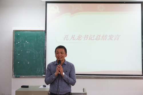 接下来进行国贸系学生党支部党务小组换届,在颁发奖状聘书后由第一届学生党务小组成员代表进行发言,随后公布新一届成员名单并由总负责人发言。最后,国贸系党总支书记孔凡龙同志对本次党员大会进行总结发言。