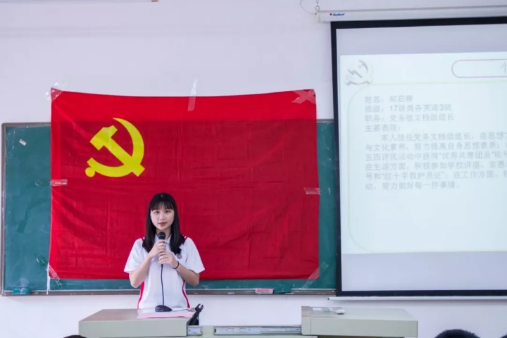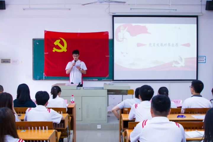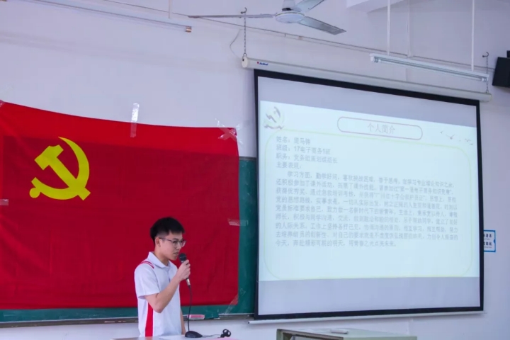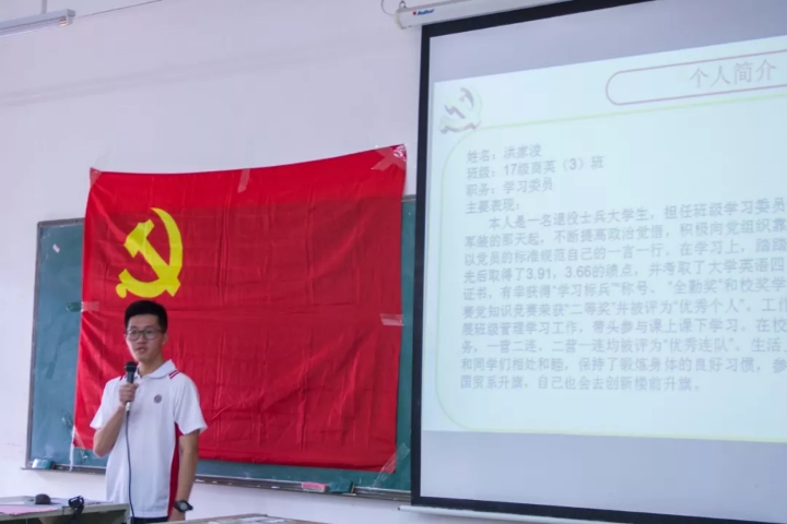 出席本次会议的有国贸学院党总支黄泽栋书记、学生党支部胡秋敏书记、教工党支部杨盛文书记、学生党支部张玉玲副书记,纪检委员李悦老师,甄伟杰老师、唐苇老师及全体学生党员。21名入党积极分子参加本次自荐,此次会议由曾家伟同学主持。随后进入党员发展对象自荐环节,主持人宣布规则,21名入党积极分子按顺序,从思想、学习、工作、生活等四个方面进行陈述自荐。